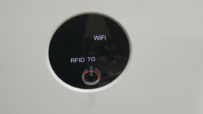 2) 중국어가 나타난 상태에서 전원버튼을 한 번 누르면 WiFi RFID TG/RD 글자만 남고 전면부의 LED가 초록-주황-빨강 순으로 변화합니다. 이 상태를 확인하였다면 다시 전원 버튼과 조명 버튼을 5초동안 눌러주어 삐삐삐 소리가 들리는지 확인합니다.