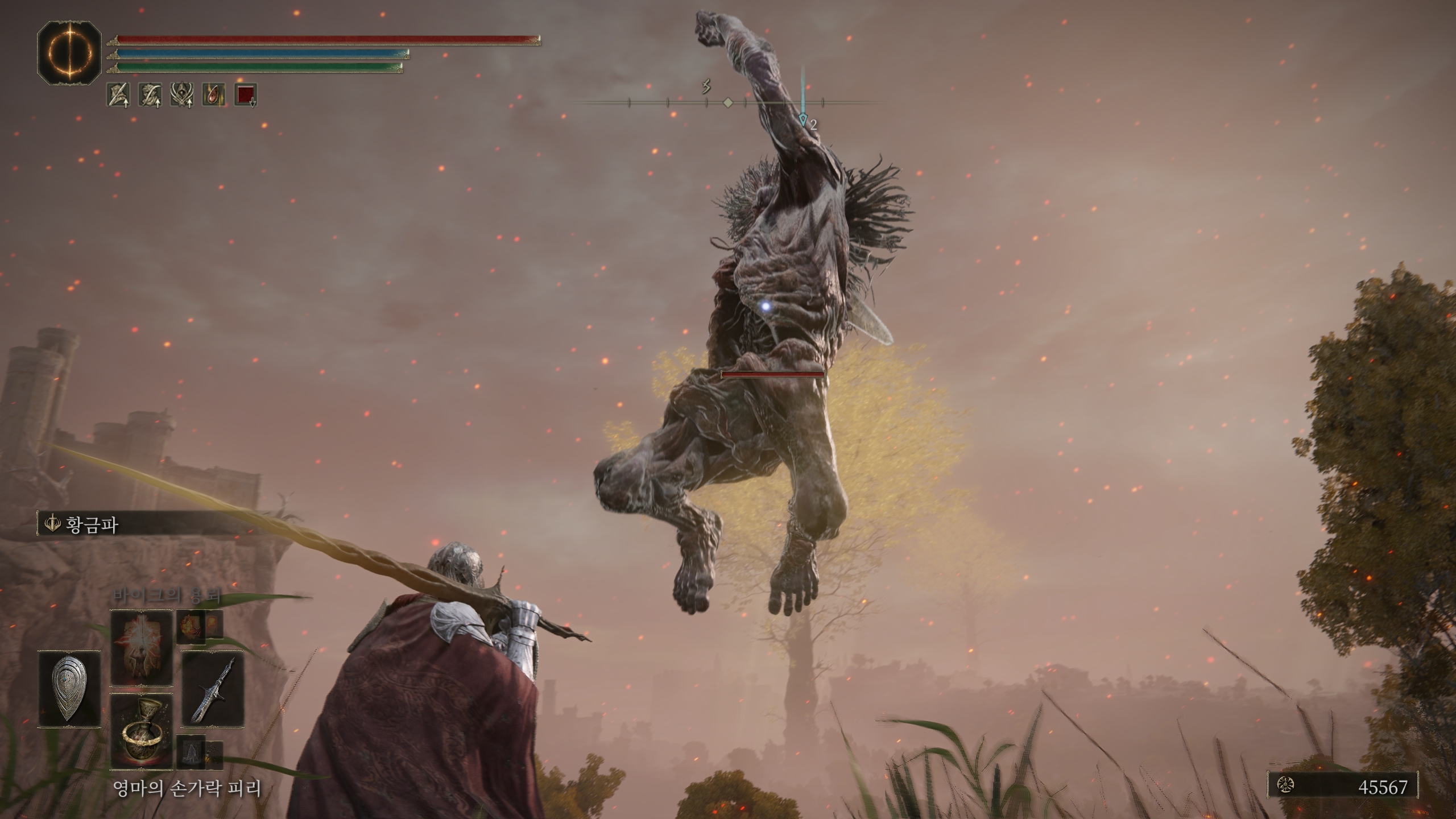 필드를 돌아다니다 보면 보스처럼 보이는 거구 몬스터들을 만날 수 있다. 처음에는 보스인 줄 알았다. 보스가 아니고서야 패턴이 이럴 수가 없으니깐.. 하지만 여긴 엘든링. 필드몬스터들도 얄짤없이 어렵다. 정말 어렵긴 하지만 말을 타고 짤짤이를 넣으면 쉽게 잡을 수 있다.