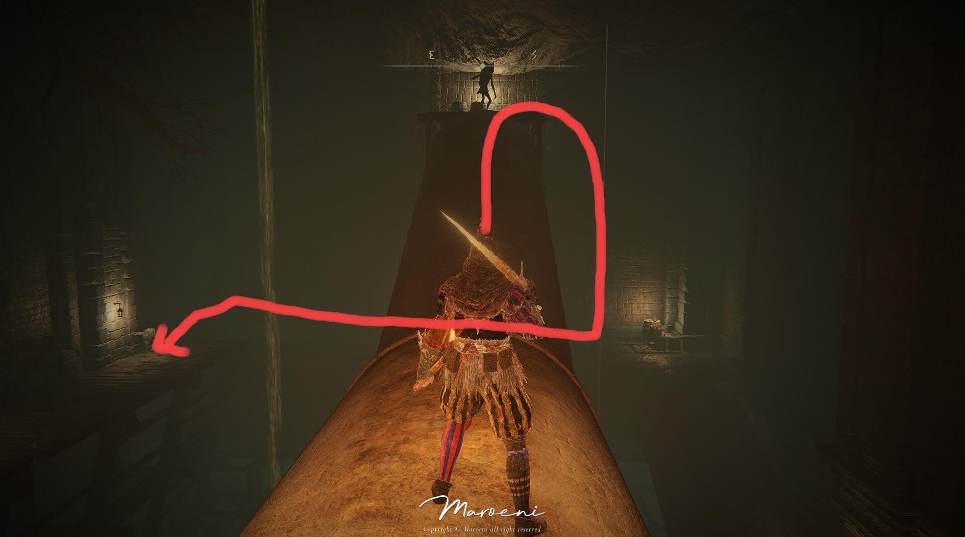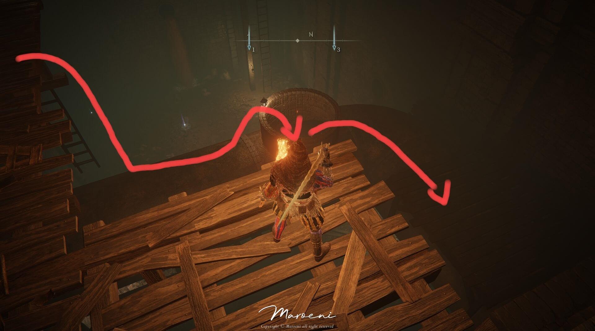 문에서 계단을 타지 말고 왼쪽을 보면 아래로 떨어지는 길이 나온다.