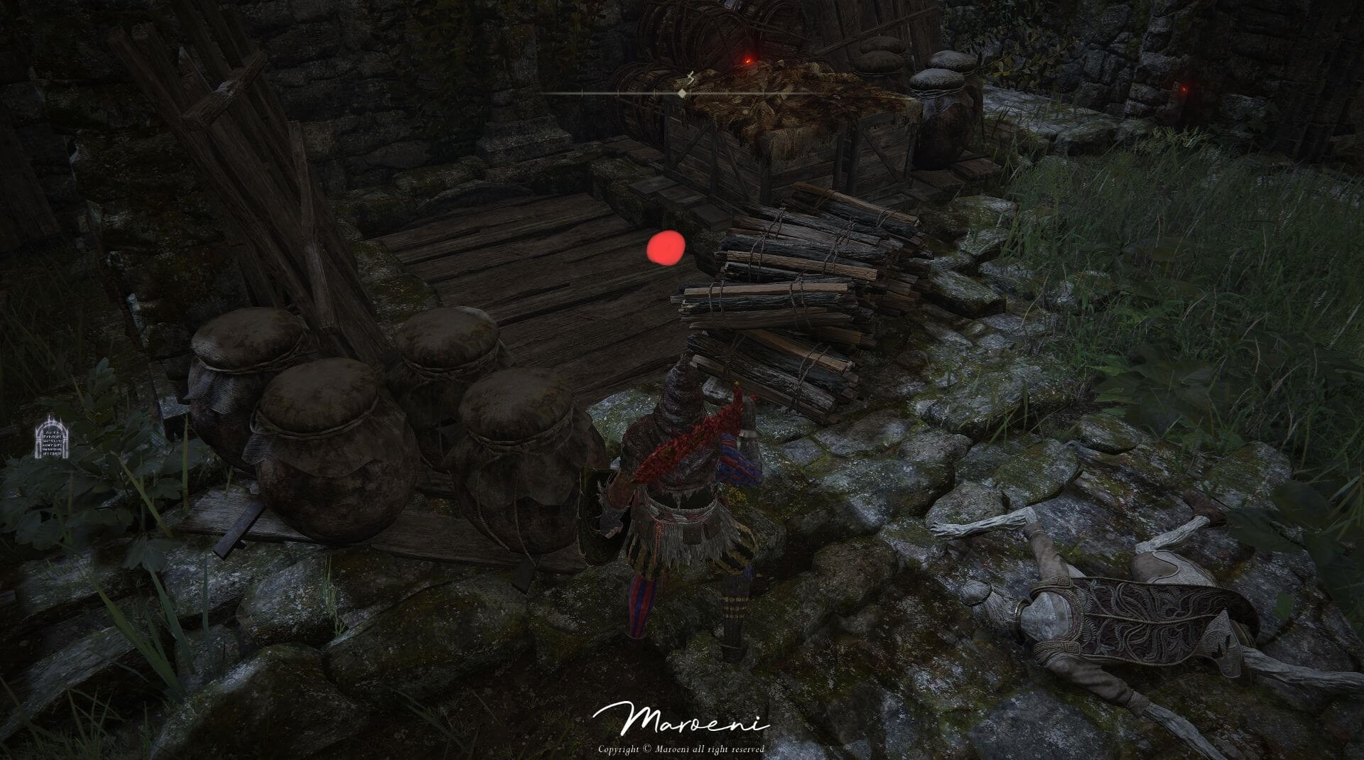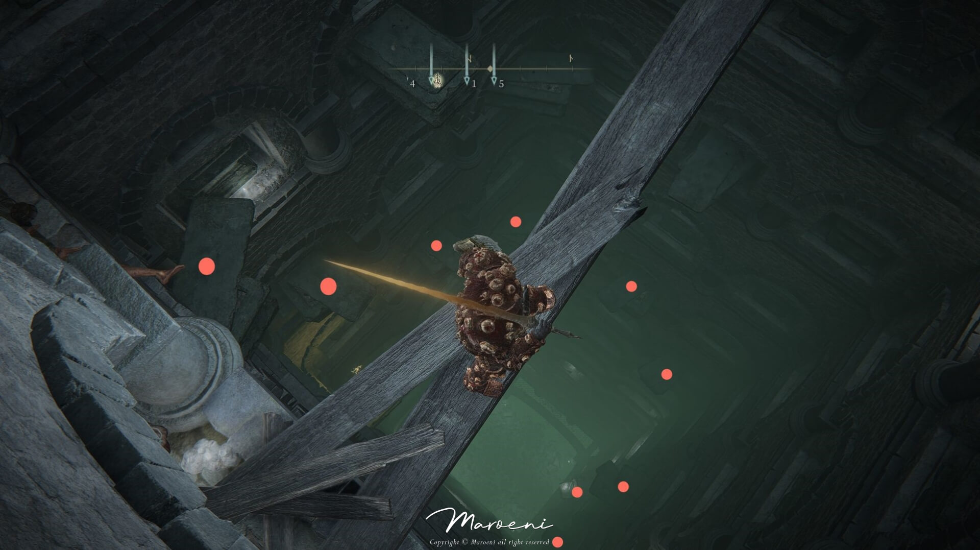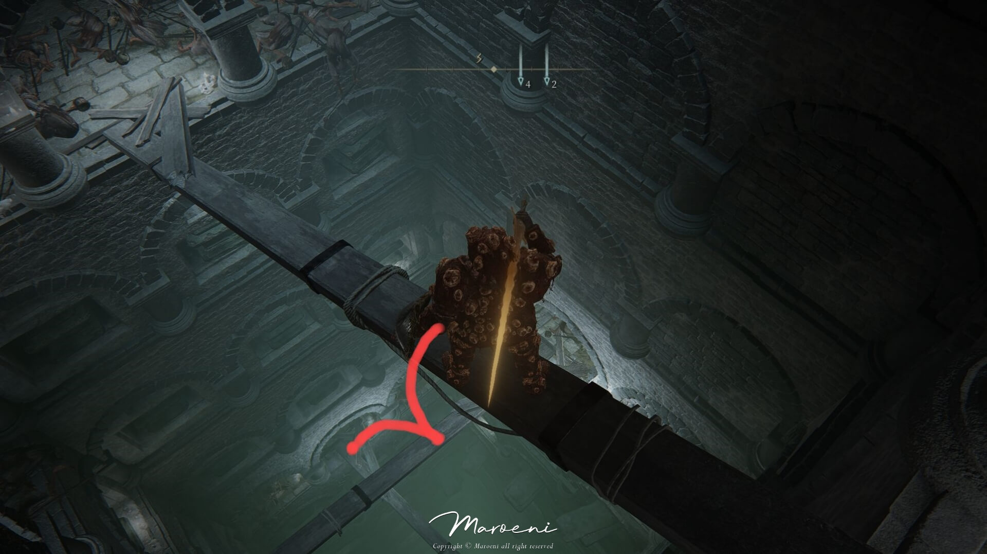 여기서부터는 아래로 내려가면 되는데.. 다크소울판 인내의 숲이라 생각하고 플레이하자.. 진짜 사람 미치게 한다. 아무튼, 사진에 표시된 대로 나무판자를 밟으며 아래로 내려가자.