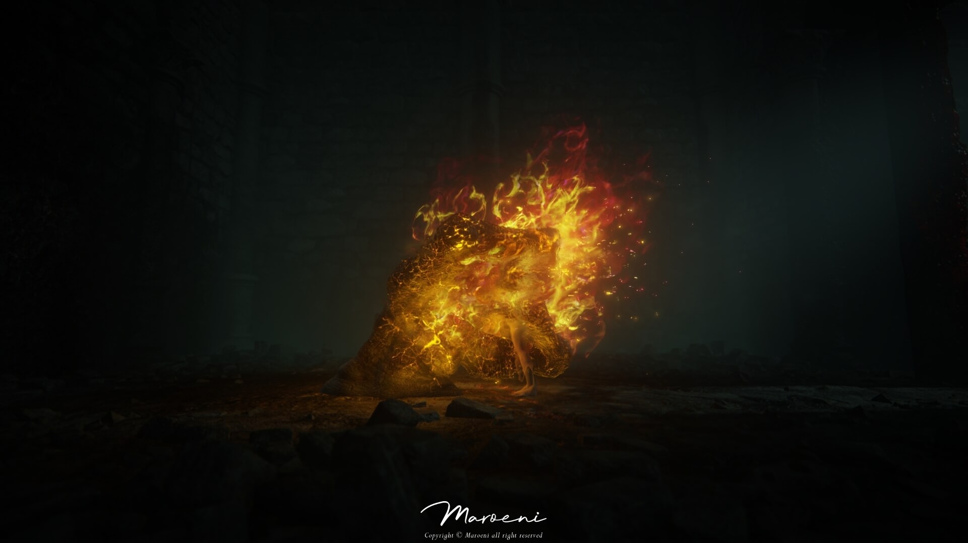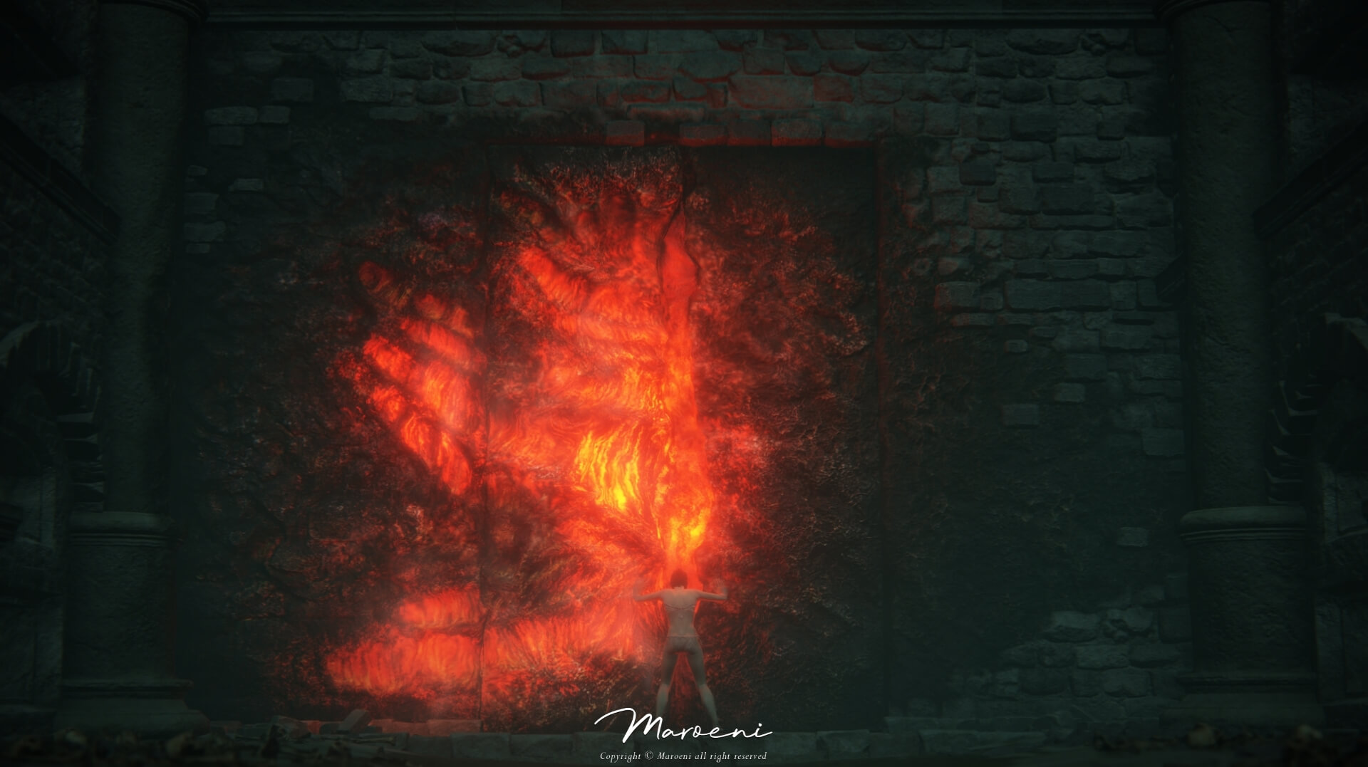 이벤트 컷신이 끝나면 빛바랜 자 몸에 커다란 화상 자국이 남아 있으며 불에 미쳐버린 사람처럼 눈동자가 활활 타오른다.