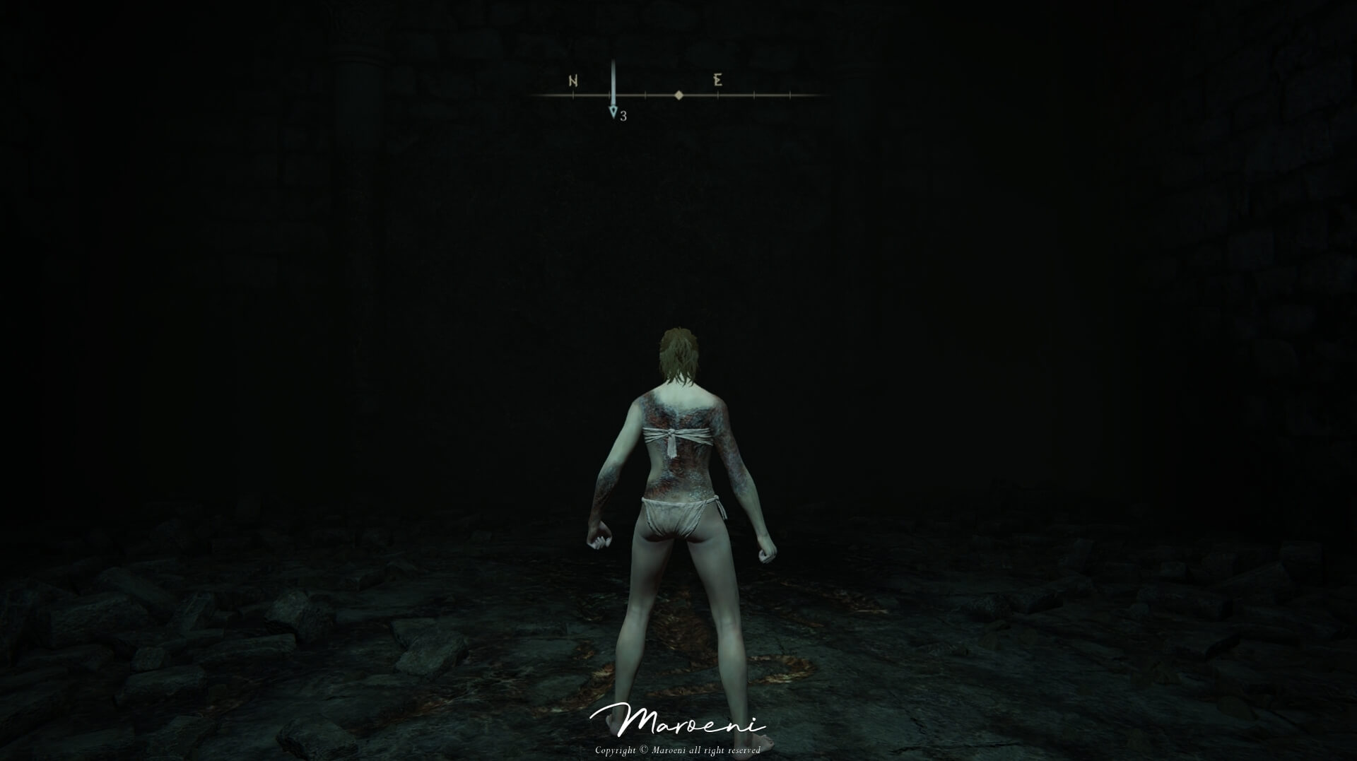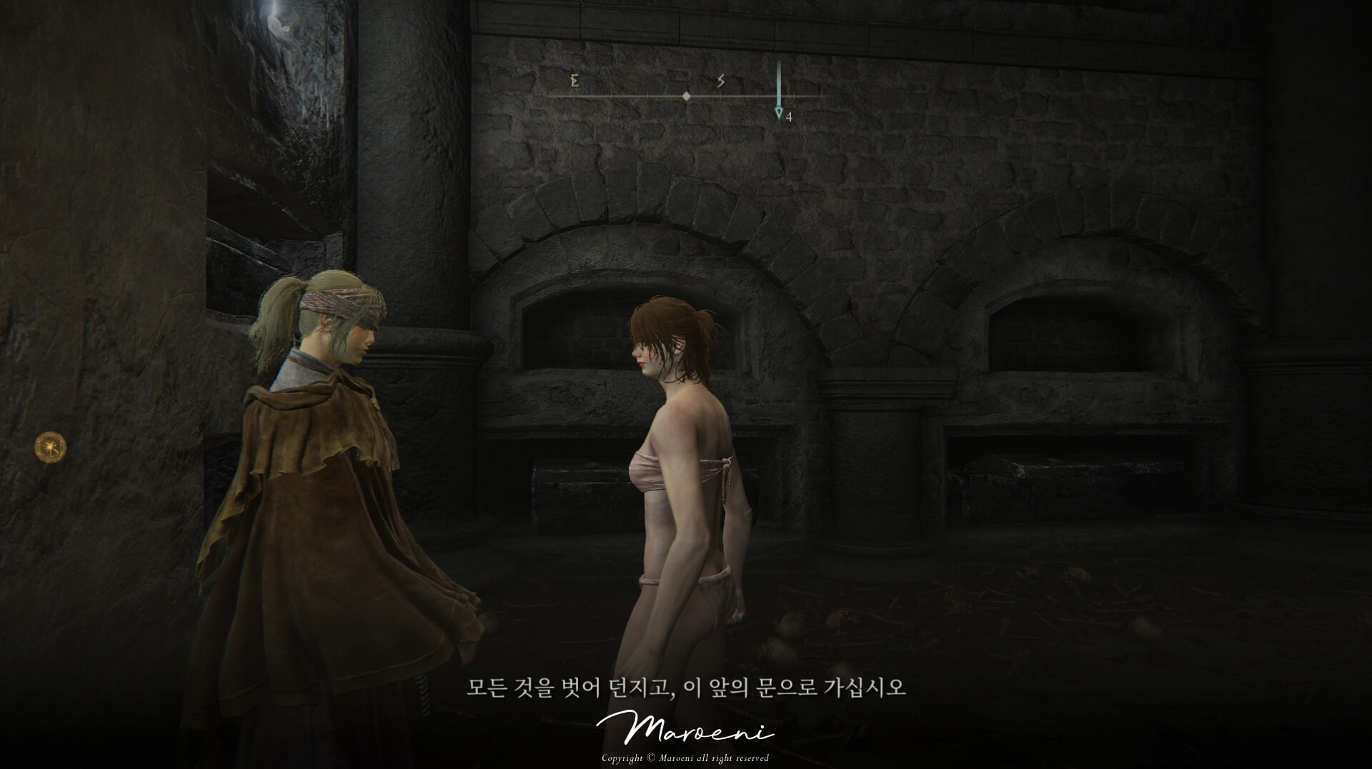 대화를 하면 "모든 것을 벗어던지고, 이 앞의 문으로 가십시오."라고 한다. 착용한 장비를 벗도록 하자.