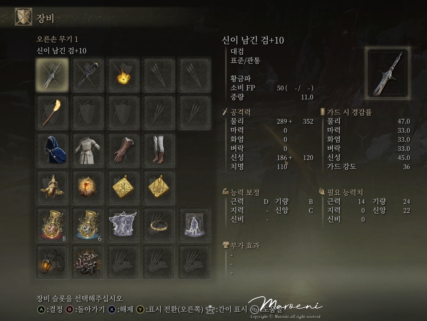 엘데의 짐승을 격파 후 얻을 수 있는 엘데의 추억으로 신이 남긴 검을 연성해야 한다. 그리고 원킬을 내기 위해 강화도 해줘야 하는데, 나는 이미 10강을 해버려서 정확히 몇 강부터 원킬이 나는지는 모르겠다. 그냥 본인이 확인해가면서 강화하는 것을 추천..
