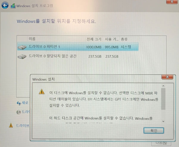 '이 디스크에 Windows를 설치할 수 없습니다. 선택한 디스크에 MBR 파티션 테이블이 있습니다. EFI 시스템에서는 GPT 디스크에만 Windows를 설치할 수 있습니다'