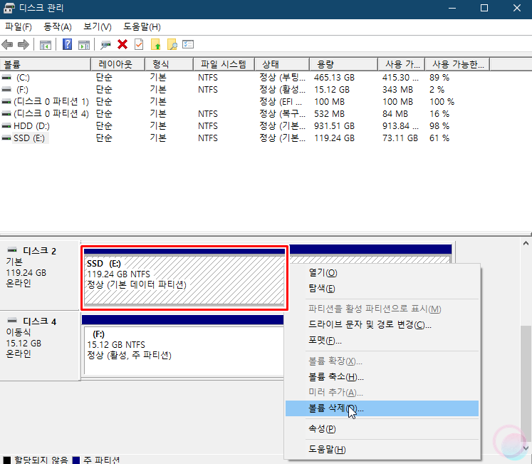 2) 윈도우 설치를 원하는 디스크를 하단에서 선택 후 마우스우클릭후 볼륨 삭제를 눌러줍니다. 디스크에 저장되어 있는 모든 데이터가 삭제된다는 경고창이 나타나면 확인 버튼을 눌러줍니다.