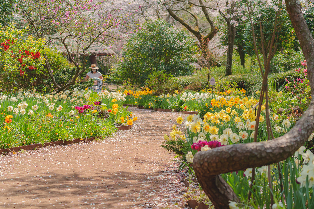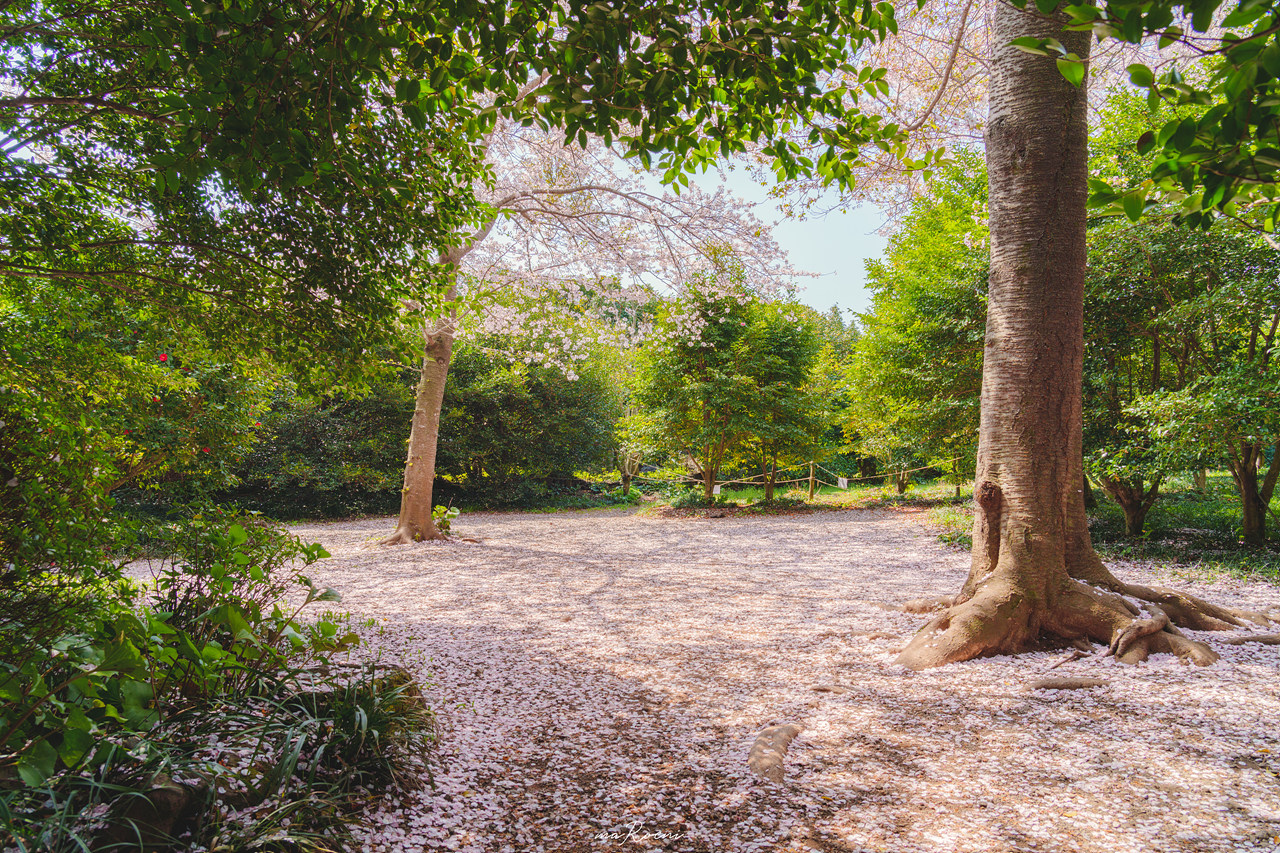 동백꽃들을 구경하면서 길 따라 걷다 보면, 벚꽃이 비처럼 내리는 숲을 발견할 수 있다. 정말 비가 내린다는 표현이 어울릴 정도로 바람이 슝~하고 불 때마다 떨어지는 벚꽃은 괜스레 마음을 간지럽게 만든다.