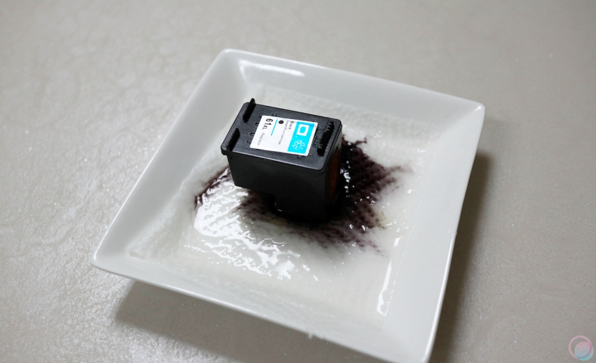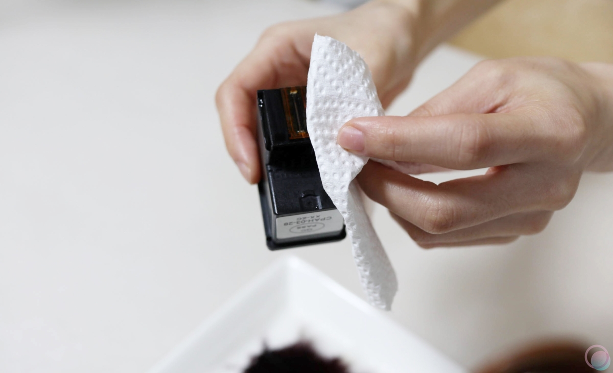 20초에서 30초정도 휴지 위에 올려두면 카트리지 노즐 부분에서 굳어있던 잉크들이 녹으면서 휴지 부분에 스며들게 되는데요. 너무 오래 놔둘 경우 카트리지 안에 있는 모든 잉크가 흘러나올 수 있으니 잉크가 녹았다는 느낌이 들면 바로 집어들어서 휴지로 노즐 부분의 물기를 깨끗하게 제거해주세요.