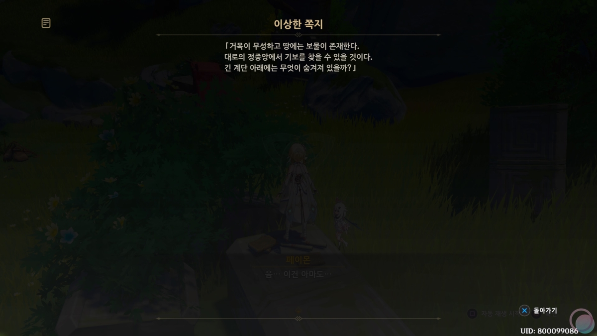 캠프 지역을 조사하다보면 이상한 쪽지를 발견하게 되고 쪽지에는 다음의 내용이 적혀있습니다.