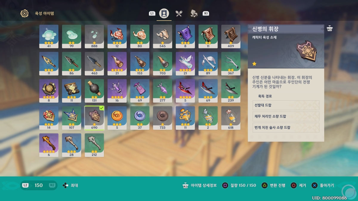 이곳에 필요 없는 육성아이템을 최대 150개까지 집어넣을 수 있는데요. 저는 테스트를 위해 신병의 휘장 150개를 넣어보도록 하겠습니다.