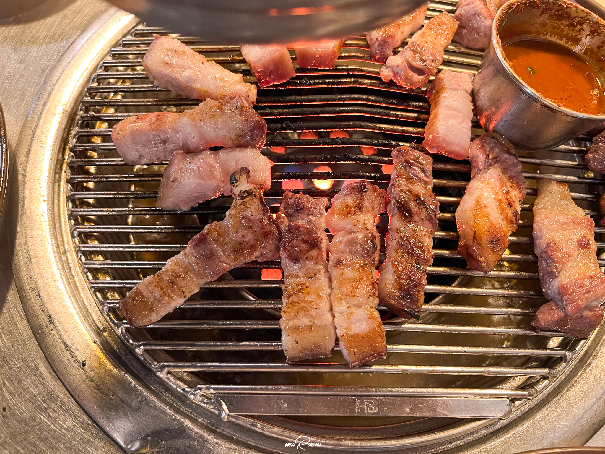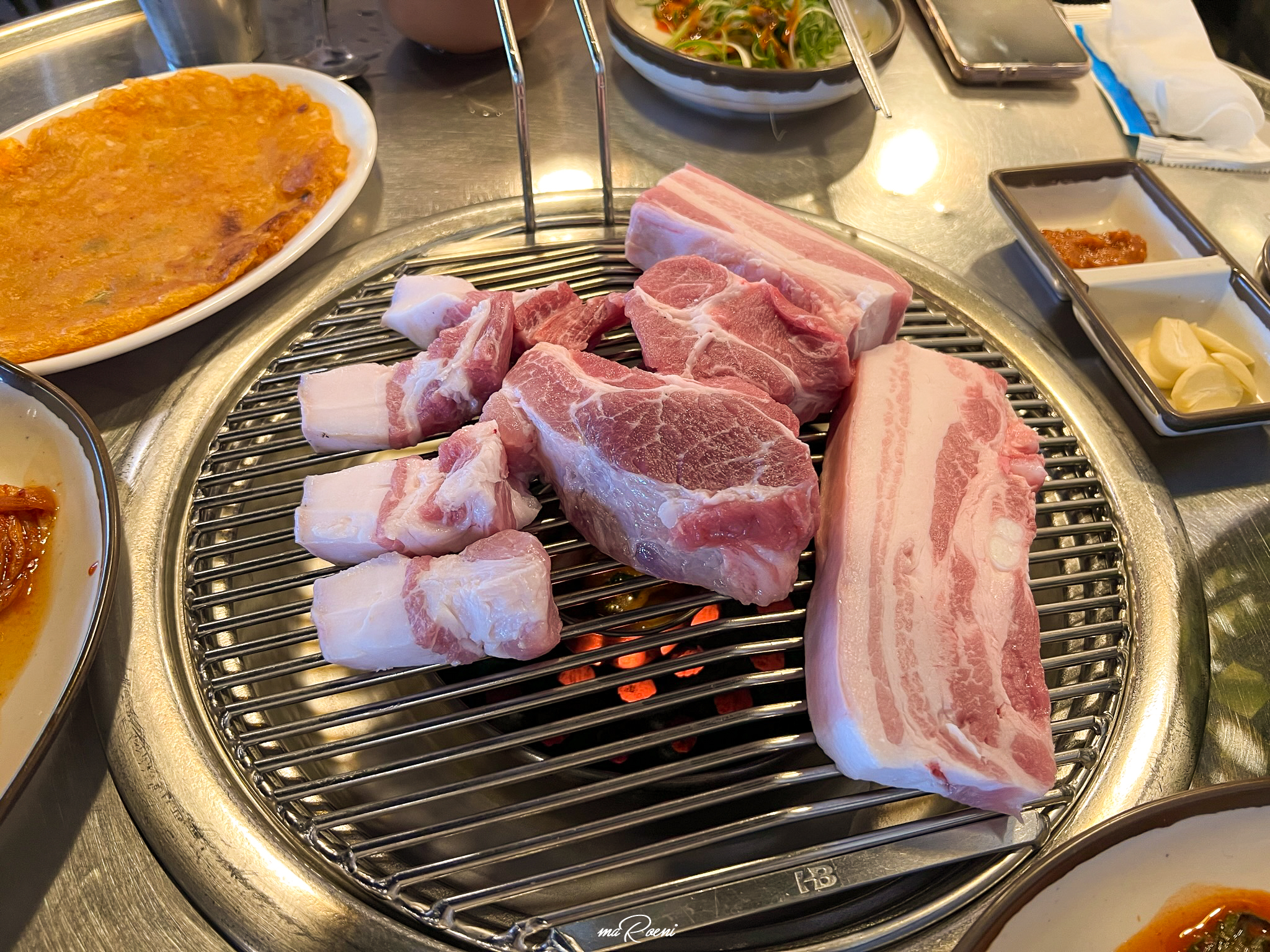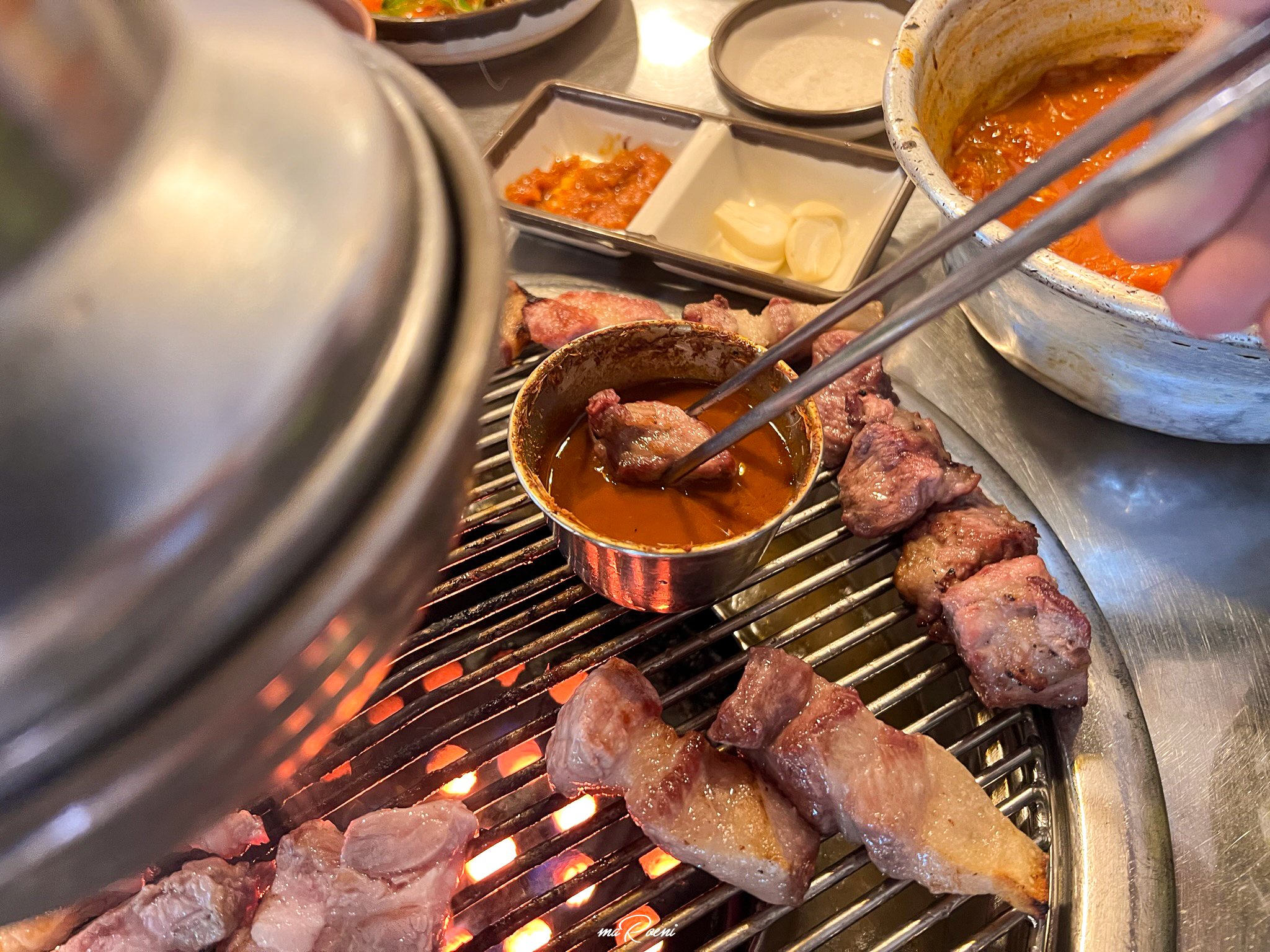 칠돈가는 연탄구이 전문점이다. 그래서 불판에 연탄을 넣어주신다. 근데 조금 신기한 건, 고기를 찍어먹을 멜젓을 불판 위가 아닌 연탄 바로 위에 올려주신다는 것이다. 처음에는 이게 멜젓이 아니라 특별한 성능을 가진 기름받이인가? 하는 생각도 들었는데 지글지글 끓어오르는 비릿한 냄새를 보니 멜젓이 확실했다.