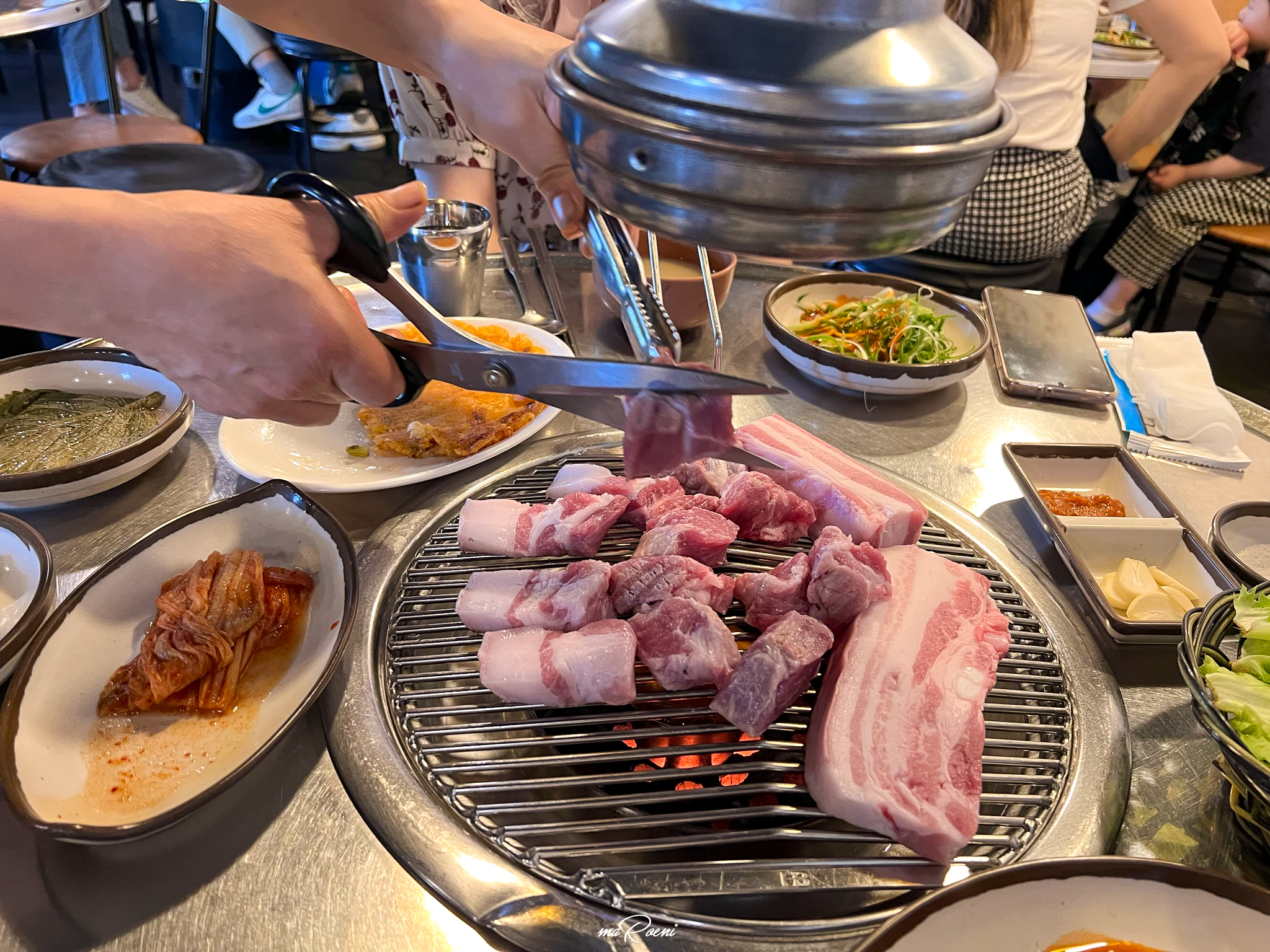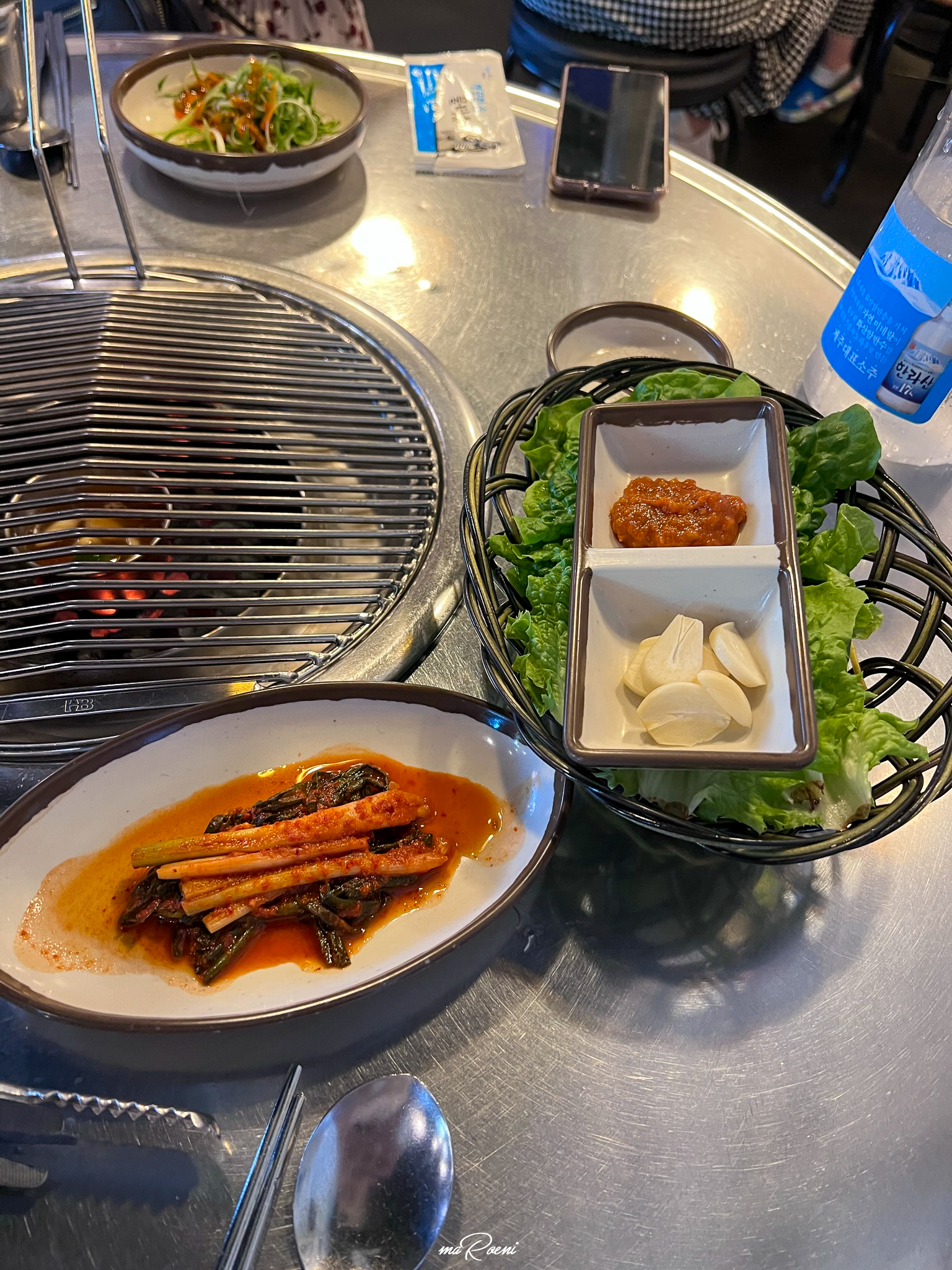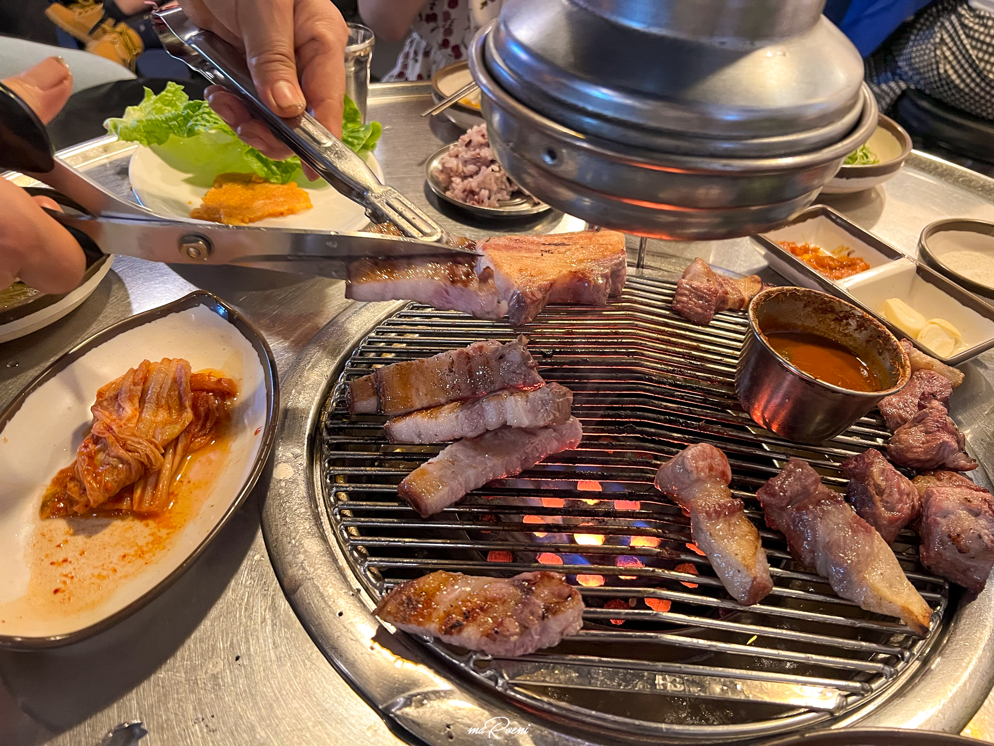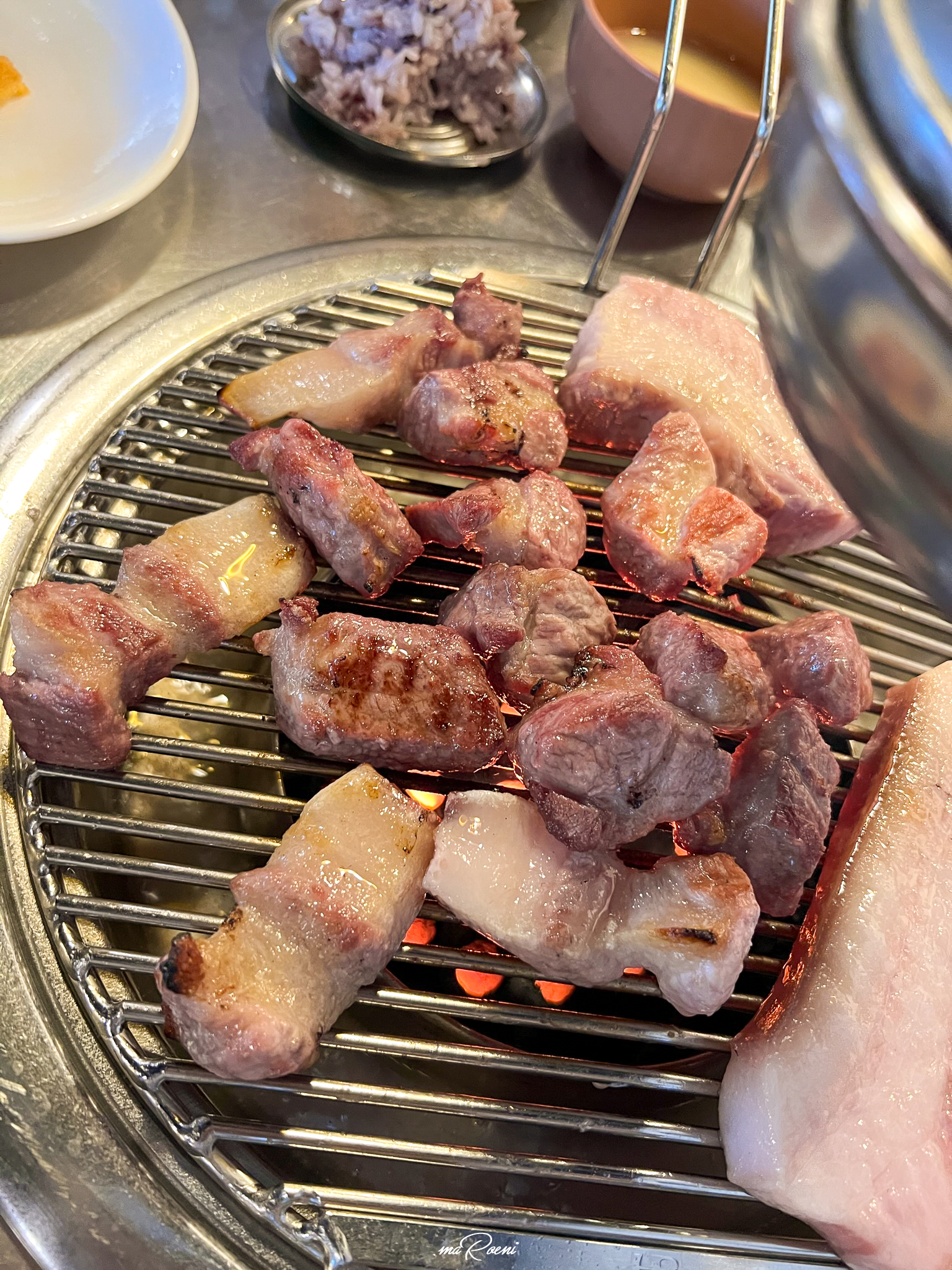 칠돈가는 연탄구이 전문점이다. 그래서 불판에 연탄을 넣어주신다. 근데 조금 신기한 건, 고기를 찍어먹을 멜젓을 불판 위가 아닌 연탄 바로 위에 올려주신다는 것이다. 처음에는 이게 멜젓이 아니라 특별한 성능을 가진 기름받이인가? 하는 생각도 들었는데 지글지글 끓어오르는 비릿한 냄새를 보니 멜젓이 확실했다.