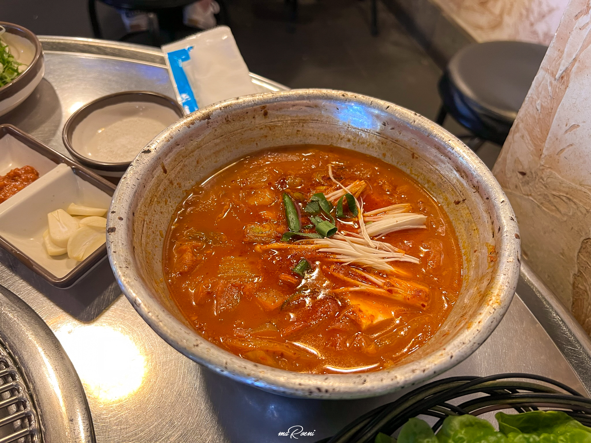 아 맞다! 다른 블로그 리뷰를 보니 여기서 고기는 안 구워 먹더라도 7,000원짜리 김치찌개는 꼭 먹어보라는 글을 봤었다. 아니 김치찌개가 맛있어봐야 얼마나 맛있다고 이걸 먹으라고 하는 건가 하는 생각에 주문을 해봤는데; OMG;; 진짜 개존맛이었다.