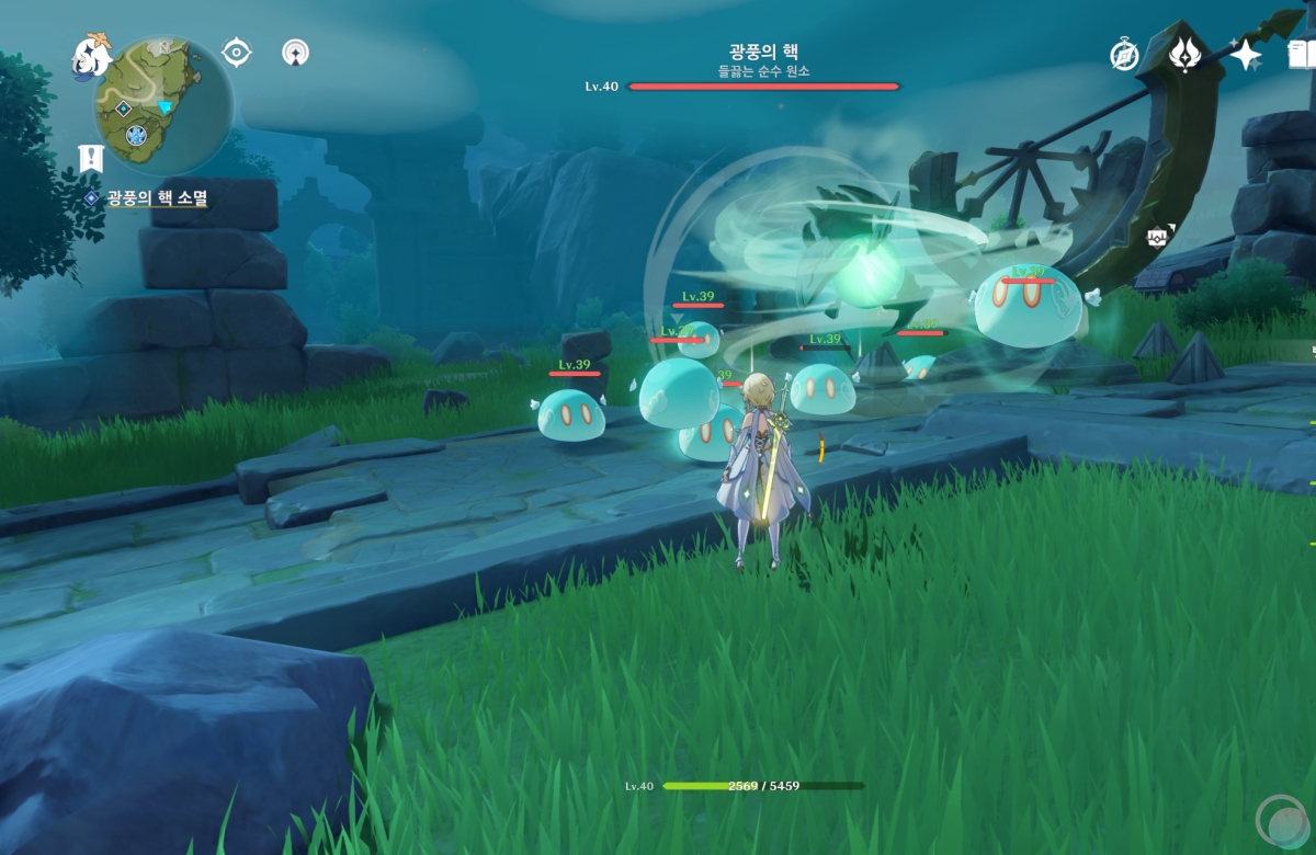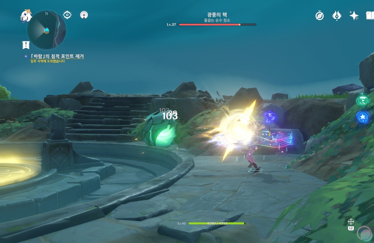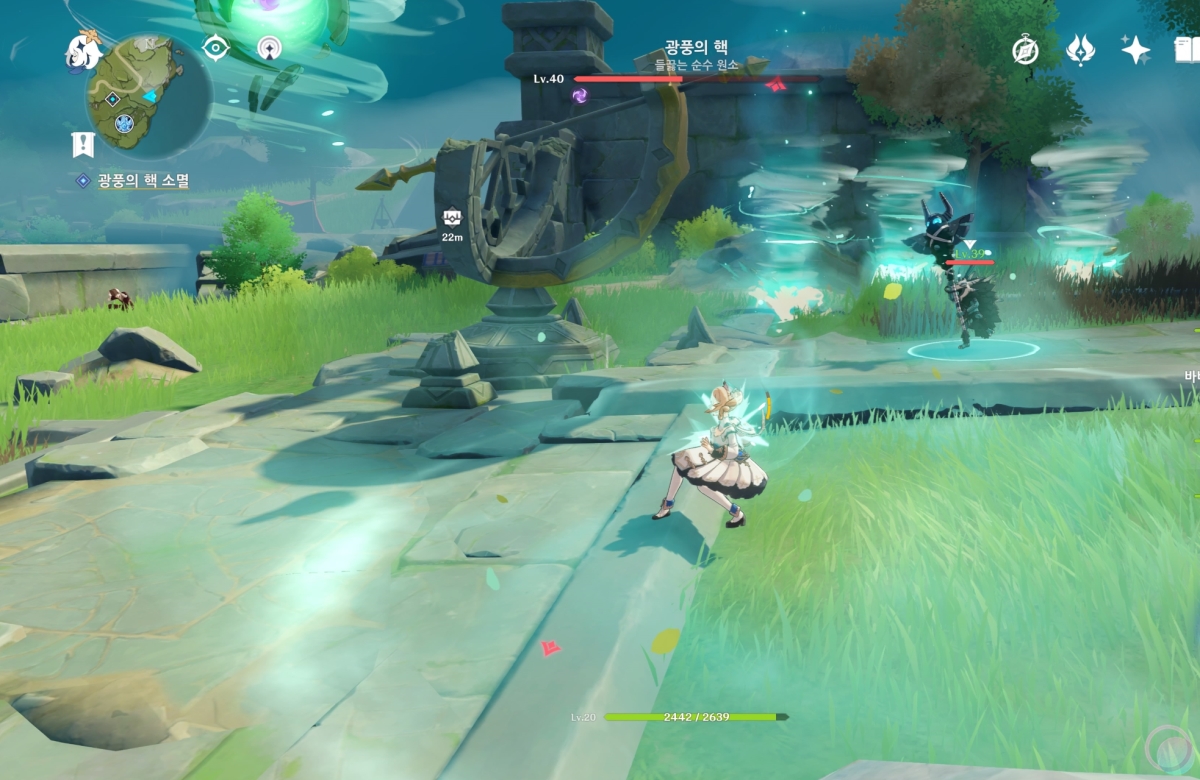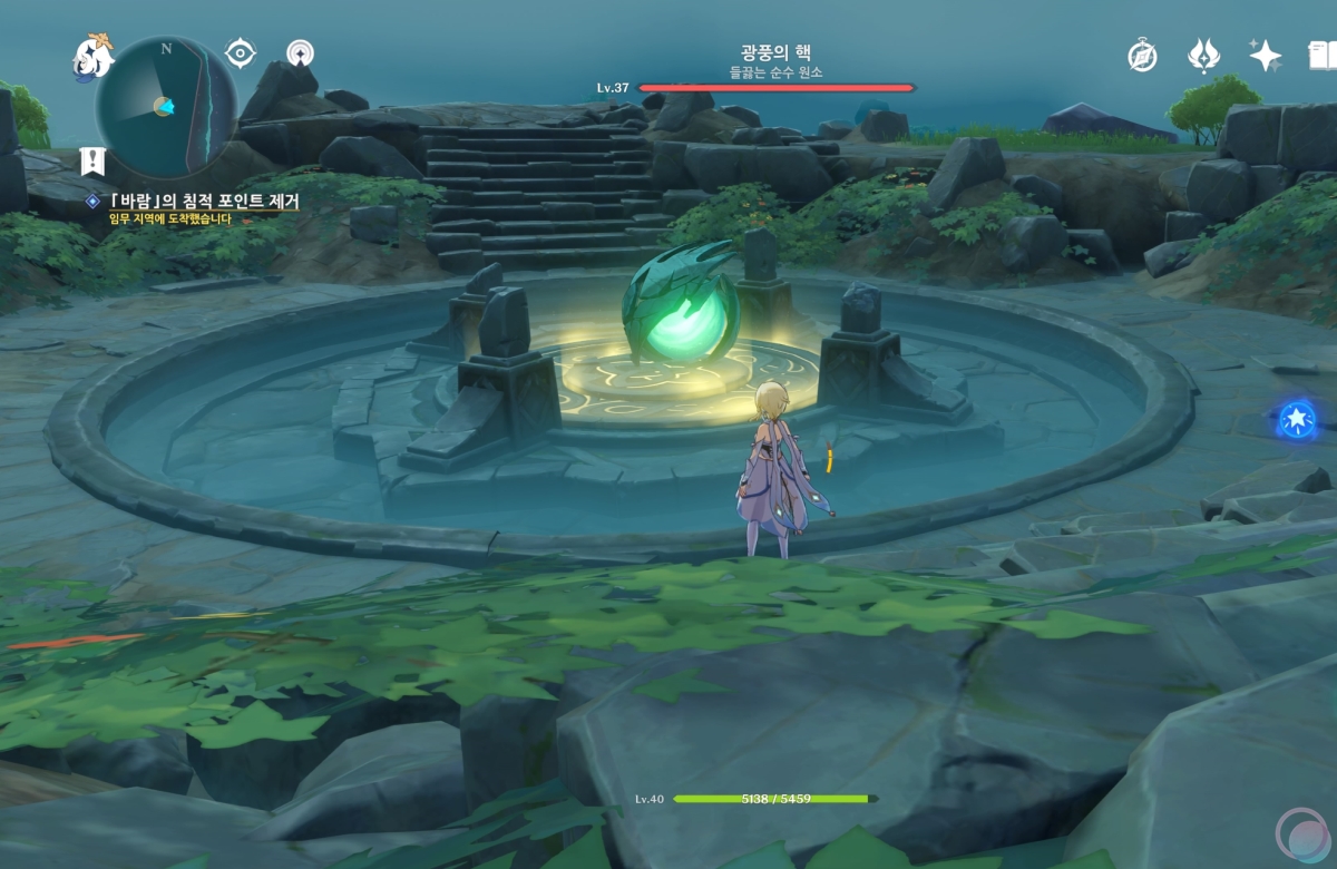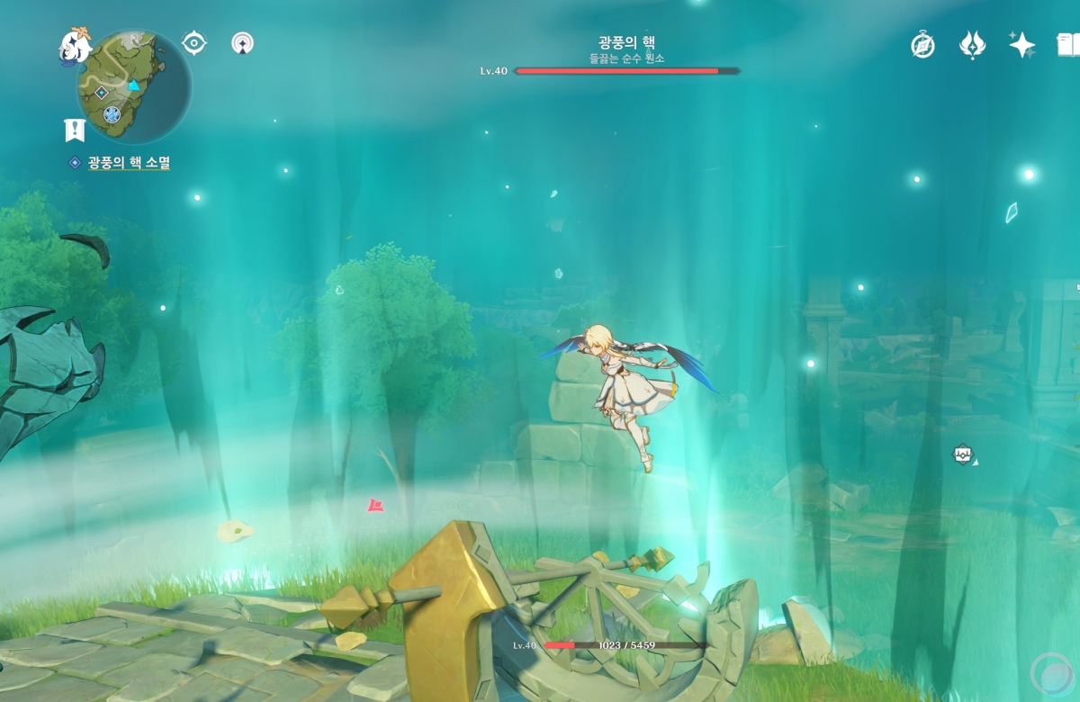 바람속으로 들어가서 원소 시야를 활성화 하면 중앙에 큰 바람 구슬이 나타나는데 바람 원소를 이용하여 제거해줍니다.