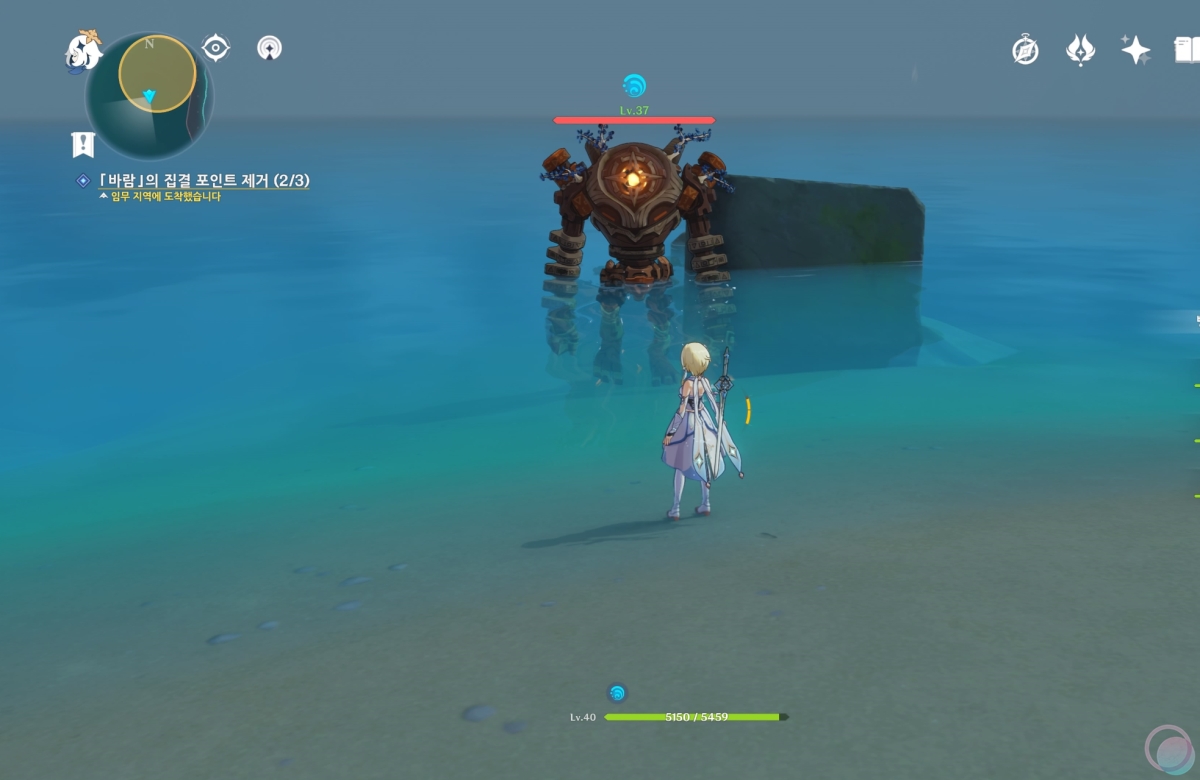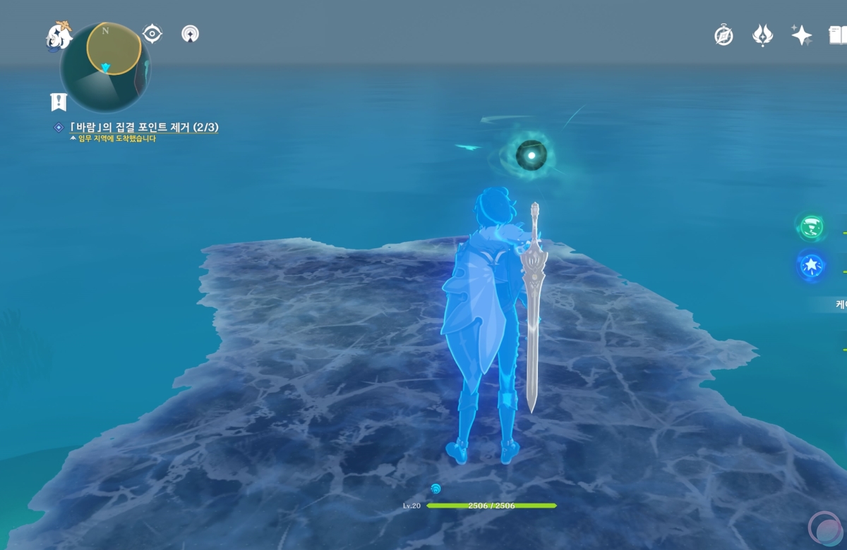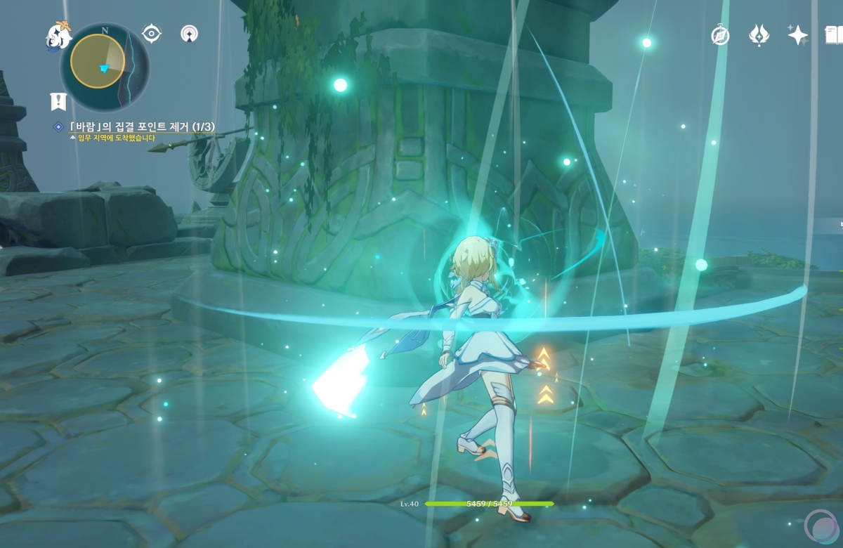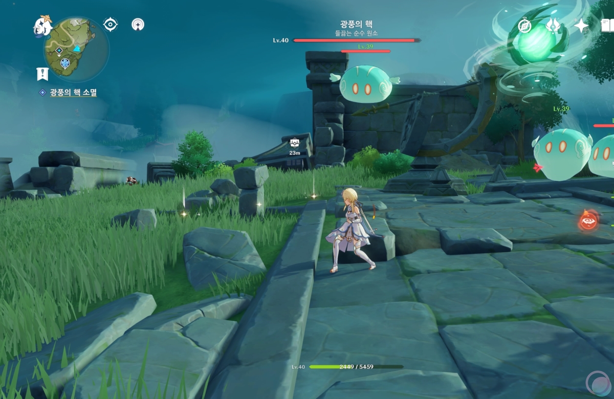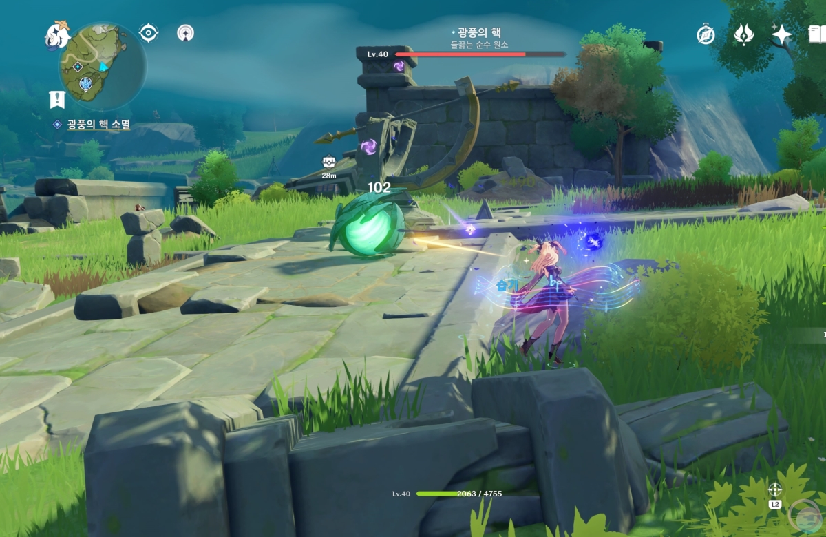 바람속으로 들어가서 원소 시야를 활성화 하면 중앙에 큰 바람 구슬이 나타나는데 바람 원소를 이용하여 제거해줍니다.