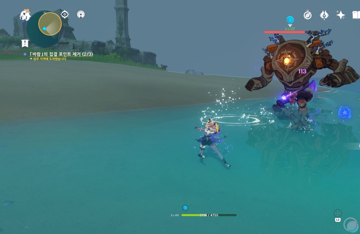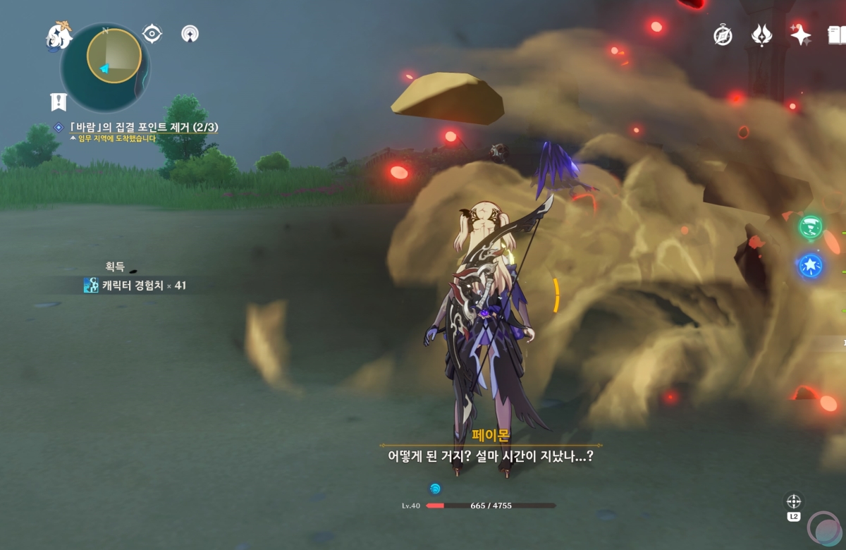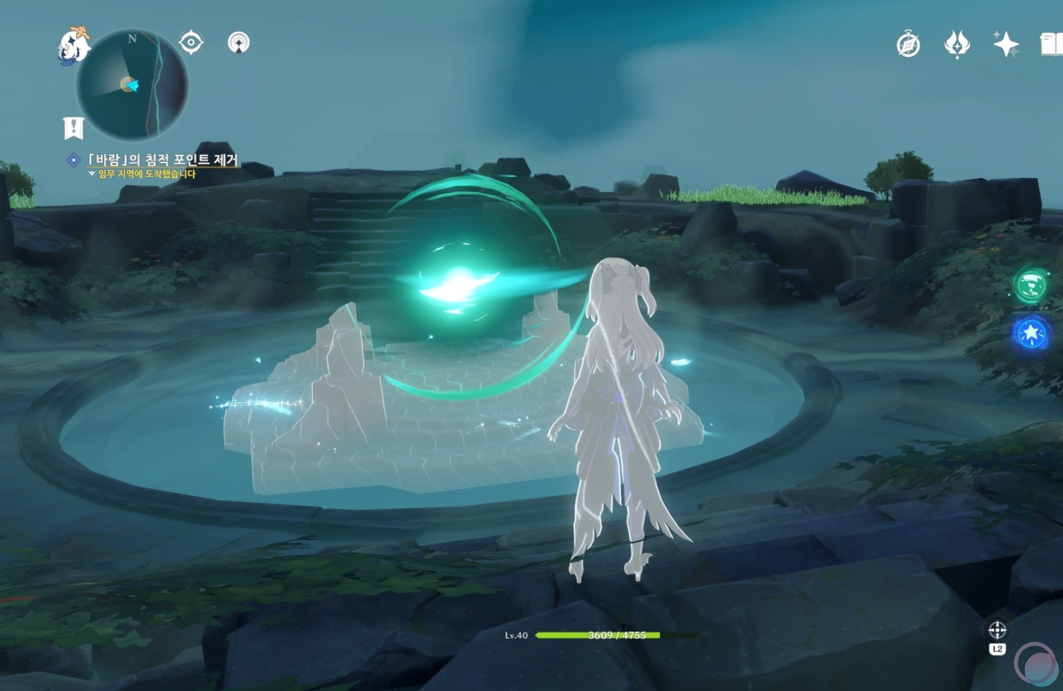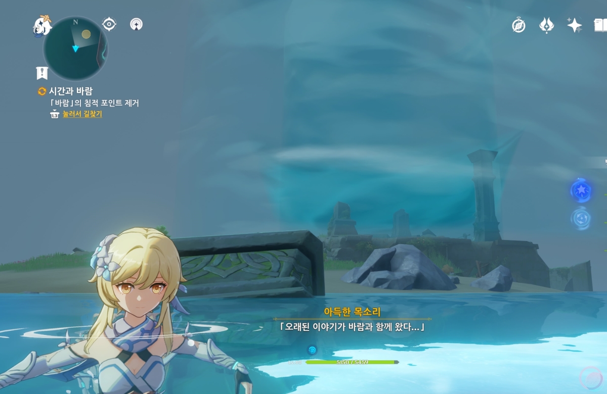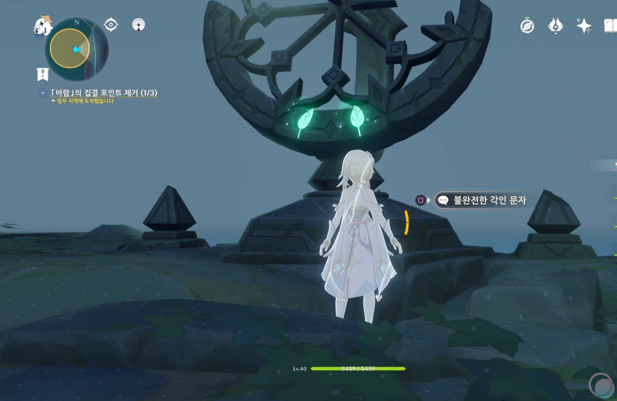 바람속으로 들어가서 원소 시야를 활성화 하면 중앙에 큰 바람 구슬이 나타나는데 바람 원소를 이용하여 제거해줍니다.