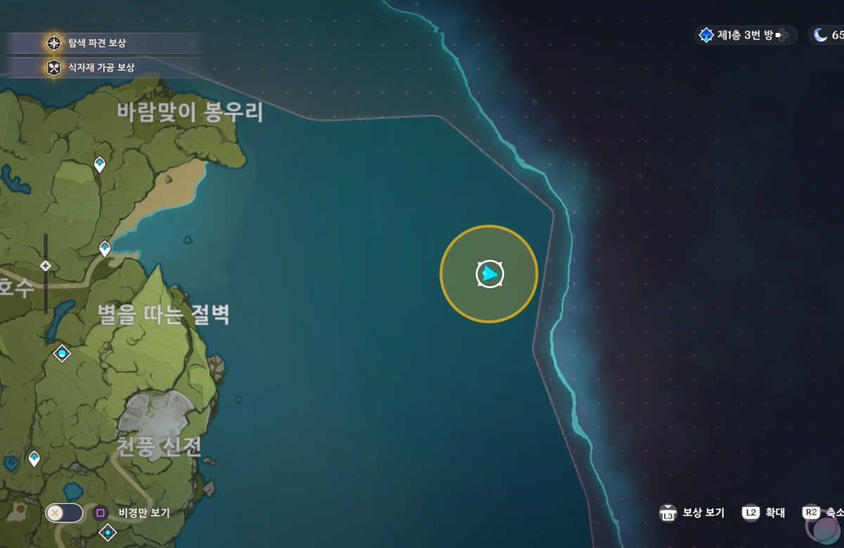 바람신의 눈동자를 수집하다보면 사진속 지도의 위치에서 무인도의 비밀이라는 히든 퀘스트를 진행할 수 있습니다. 이 퀘스트는 무인도에 간다고 하여서 바로 시작되는 것이 아닌 특정 조건을 충족해야만 퀘스트를 시작할 수 있는데요.
