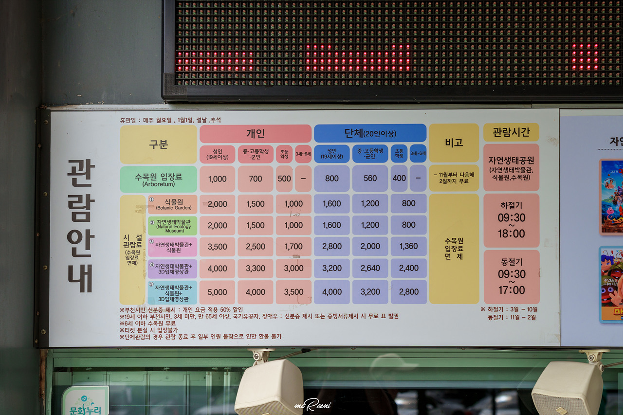 주차요금은 30분에 400원이고 그 이후부턴 10분당 200원이 추가된다. 그리고 각 시설마다 입장료가 존재하는데, 패키지로 이용하면 조금 더 저렴한 가격으로 이용할 수 있으며, 부천 시민일 경우에는 신분증을 제시하면 50% 할인혜택도 받아볼 수 있다. 역시나 부천 토박이인 나와 여자친구는 식물원(나비정원)+무릉도원수목원+자연생태박물관 조합의 3번 패키지를 할인받아 1인당 1,750원, 총 3,500원을 결제했다. 3D입체영상은 재미없을 것 같아서 패스함.