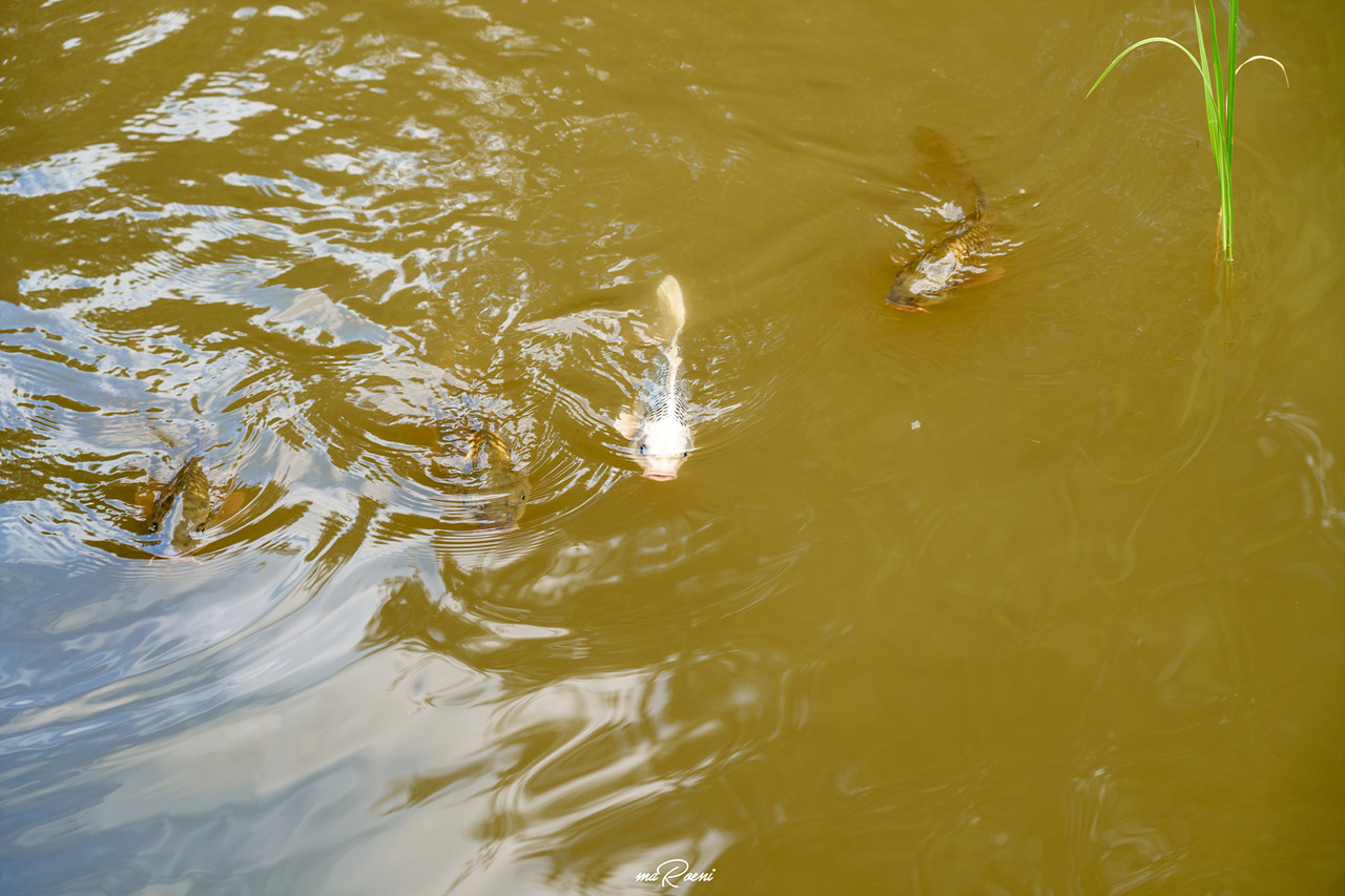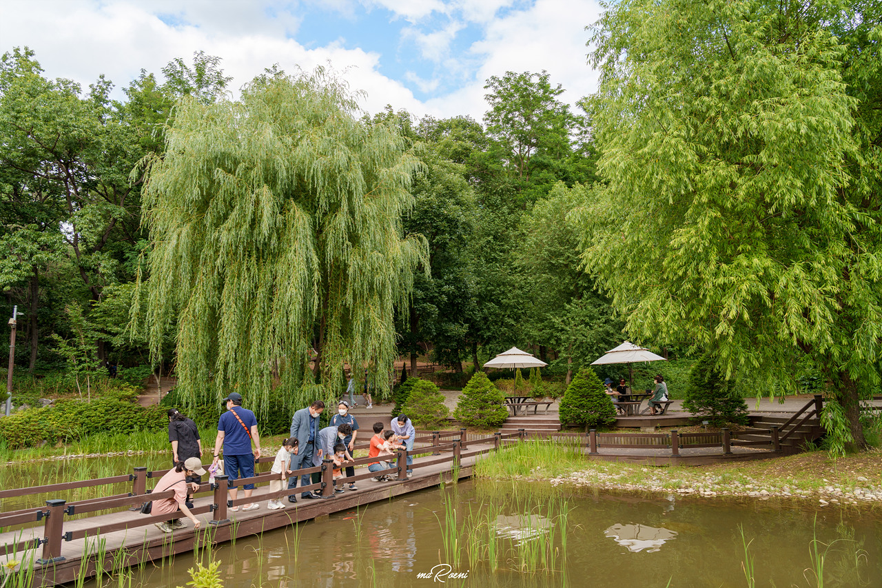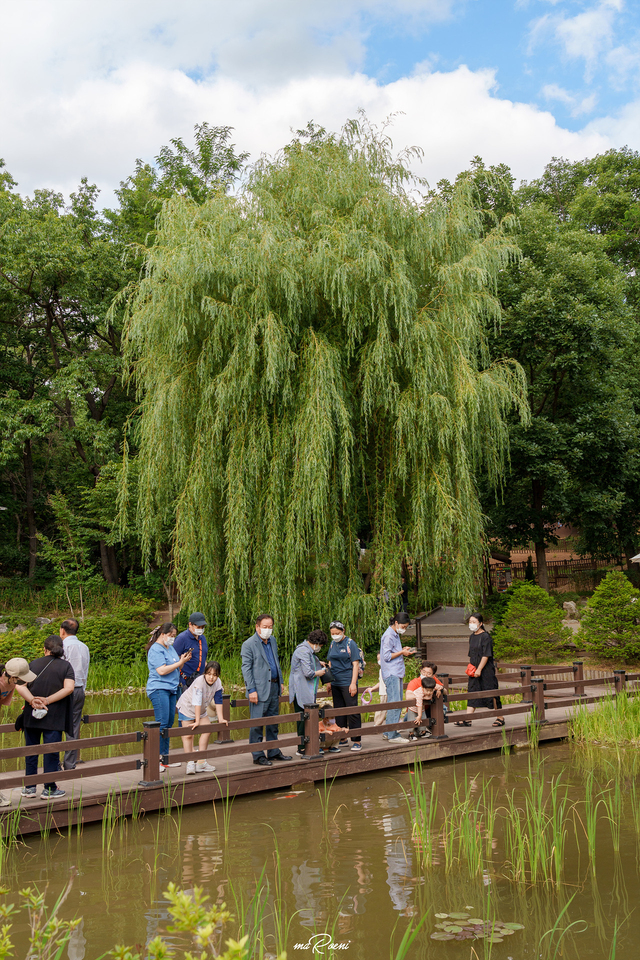 많은 사람들이 수양버들 아래에 모여서 물가를 바라보고 있었다. 가까이 다가가 보니 팔뚝만 한 잉어들이 있더라.(수염같은게 있으면 잉어라고 하던데, 수염이 있었음) 근데 여긴 음식물 반입 금지+판매도 하지 않아서 먹이를 줄 수가 없다. 아쉬운대로 주변에 떨어진 잎사귀를 잘게 부수어 먹이처럼 뿌리니깐 이 돌머리들이 먹이인 줄 알고 우르르 모여들더라ㅋㅋ 꿀잼이었다.