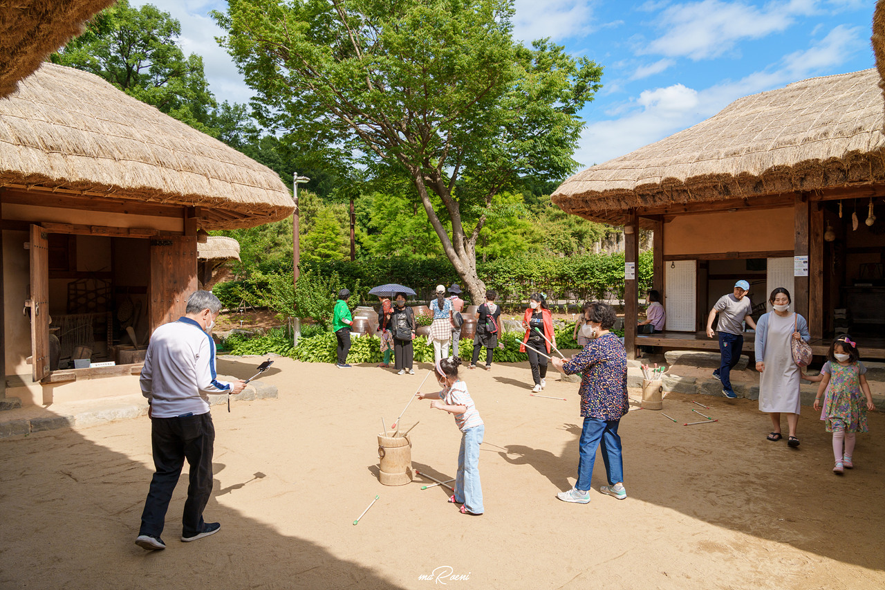 안뜰로 들어가면 농경에 필요한 여러가지 도구들과 소 모형이 전시되어있다. 특히나 이 장소는 민속놀이를 직접 체험할 수 있기 때문에 아이들이 쉽게 자리를 뜨지 못하는 장소다. 한 번만 더 해보고 가자는 아이들, 빨리 다음 장소로 이동하자는 부모님들, 가만히 보고 있으면 절로 웃음이 난다.