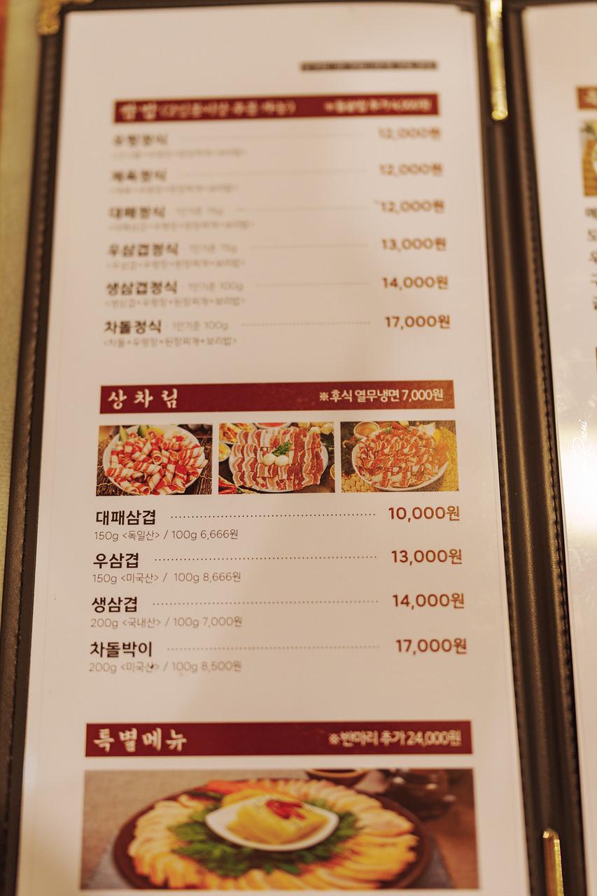 보리쌈밥집 메뉴판. 우리는 심플하면서도 무난한 대패정식 \12,000원짜리를 주문했다. 백종원의 쌈밥집은 차돌정식이 \14,000원인데 여긴 \17,000원이나 하더라. 흠.. 백종원쪽으로 갈걸 그랬나 싶기도ㅋ