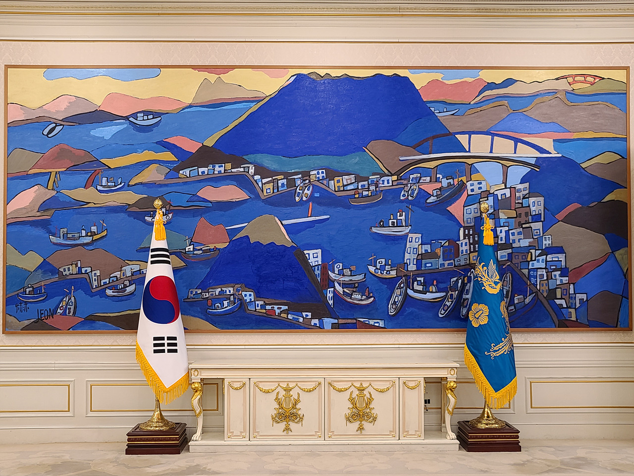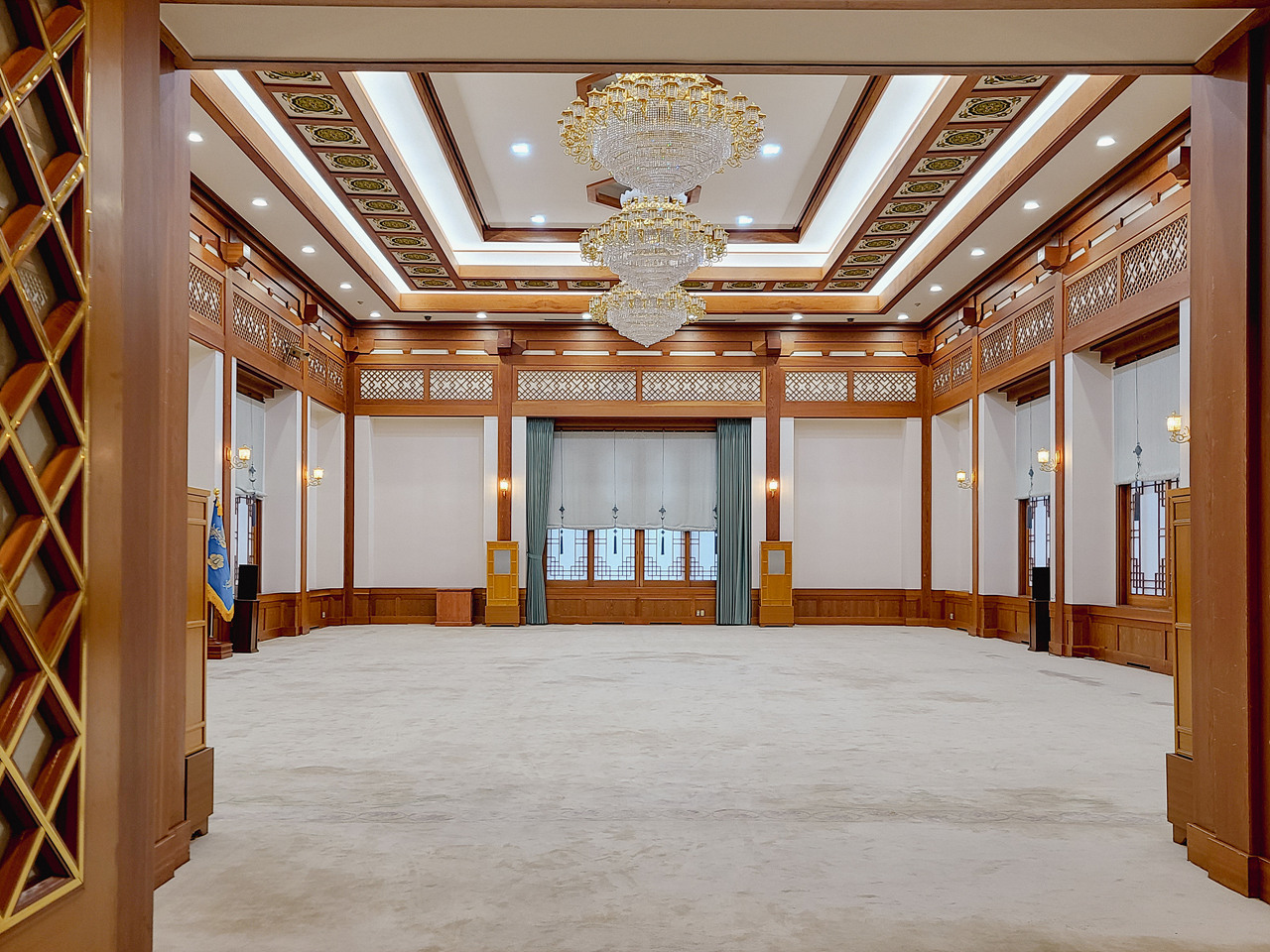 아무것도 없어서 쓸쓸해 보이는 식당 만찬장. 이런 곳에서 밥을 먹어본다면 얼마나 좋을까? 군대에서 그렇게도 기피했던 똥국만 먹어도 기분이 좋을듯. 그 앞으로는 그림이 하나 걸려있는데 이곳으로는 들어갈 수 없기 때문에 멀리서 셀카를 찍는 사람들이 많았다. 나름 청와대 본관의 포토스팟?