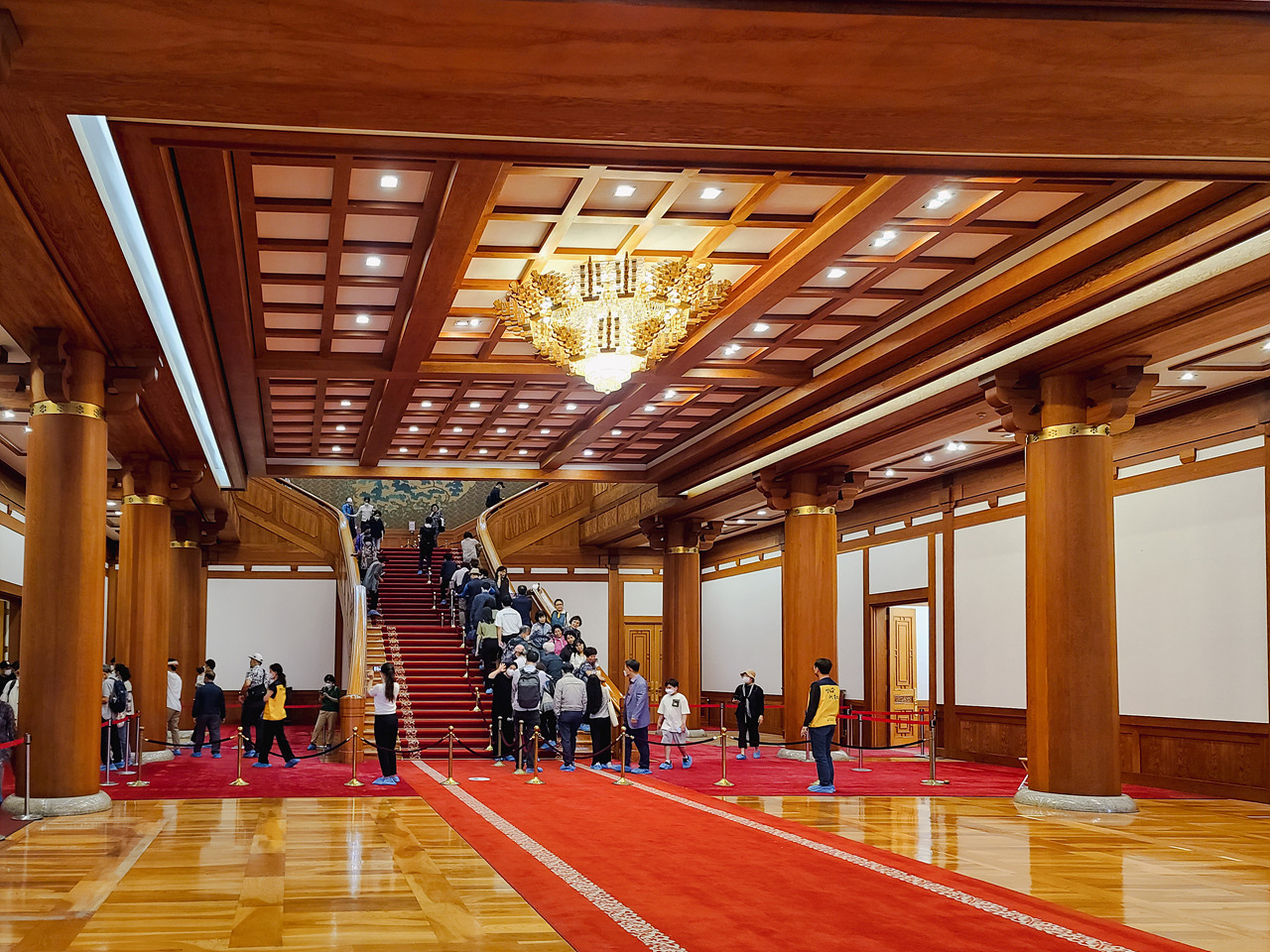 청와대 본관으로 들어오기 위해서는 신발 위에 덧신을 신어야 한다. 덧신을 신고 들어가면 이렇게 생긴 로비를 만나볼 수 있다. 사람들이 너무 많았고 사진스팟에서 기념사진을 남기기 위해 줄을 서고 있는 사람들도 많아서 진행에 어려움을 겪었다.