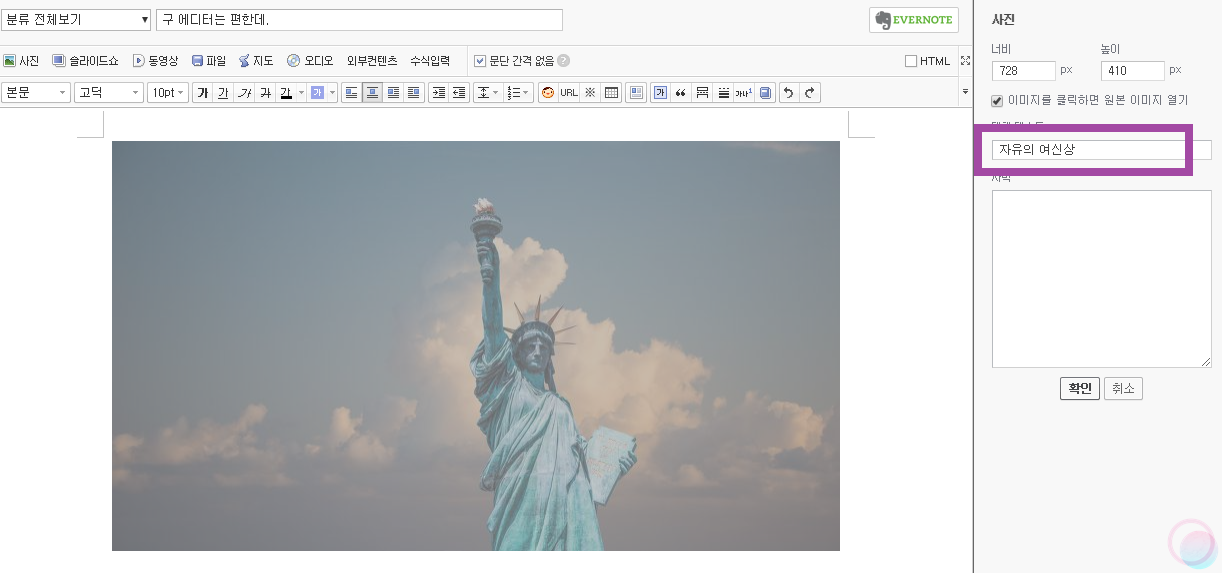 기존에디터(구에디터)에서는 이미지를 업로드한 후 업로드된 이미지를 선택하여 오른쪽 탭에서 ALT 태그를 쉽게 추가할 수 있었습니다.