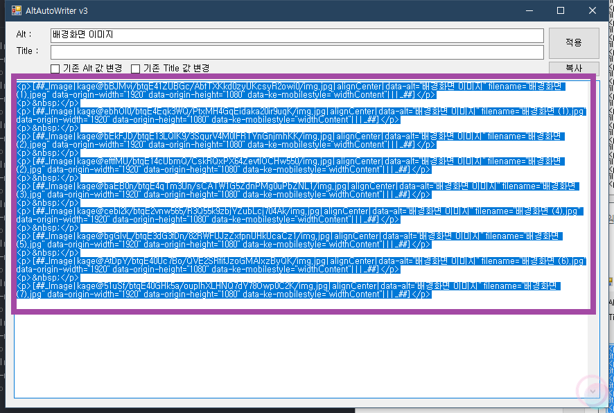 5) 이후 최상단에서 ALT 값을 입력해준 후 적용을 눌러줍니다. 그러면 모든 이미지에 자동으로 ALT 태그가 생성됩니다.
