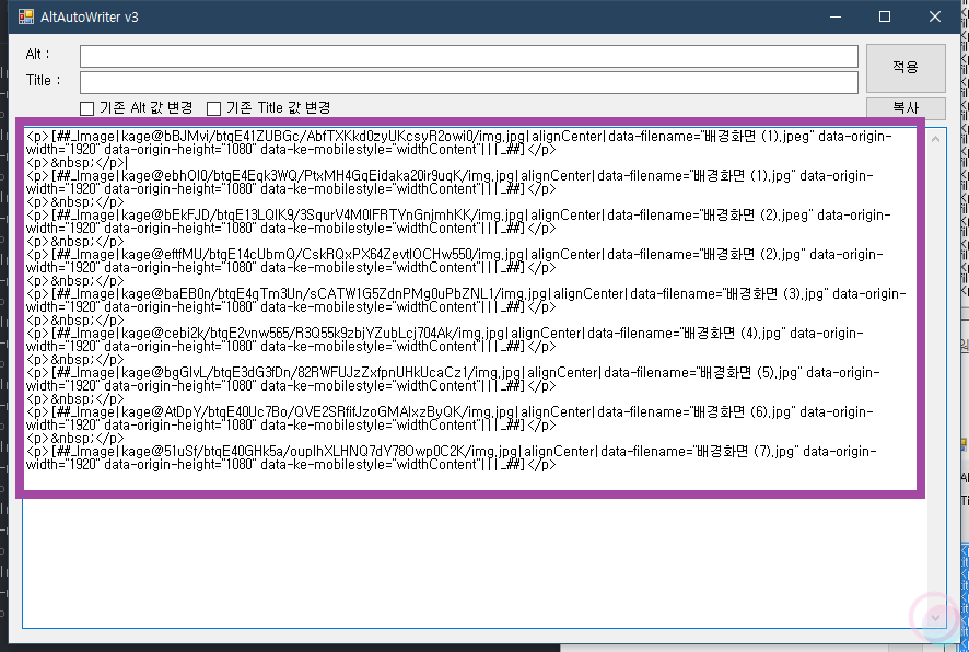 6) 변경된 코드를 복사한 후 티스토리 신규에디터 HTML 화면에 그대로 붙여넣기 해주시면 됩니다. 주의하셔야 할 부분은 앞에서 설명했던 것처럼 신규에디터는 여러개의 이미지가 붙어있으면 <p>태그 하나로 묶이게 되는데 이 상태에서 AltAutoWriter를 사용하면 하나의 이미지로 인식하여 ALT 태그 역시 하나만 들어가게 됩니다.