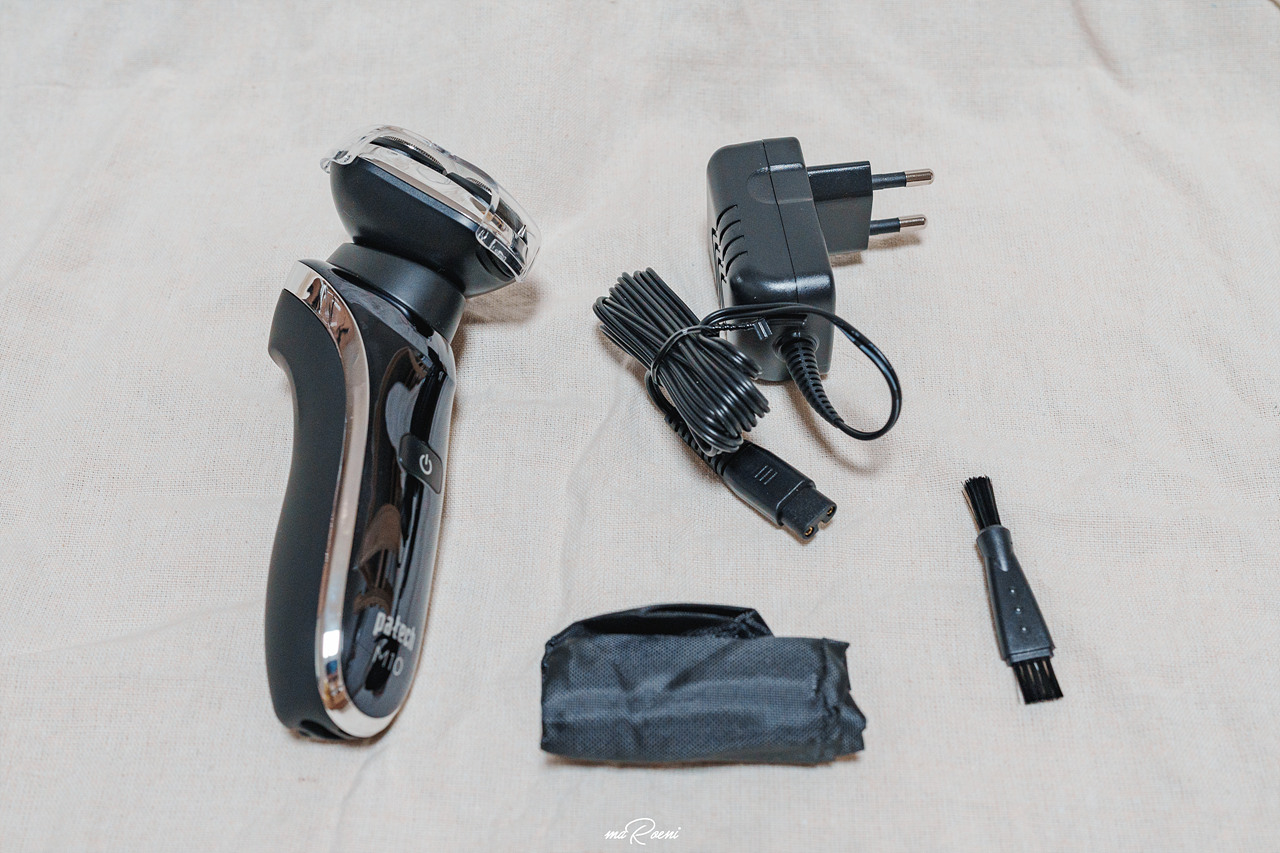 파테크 M10의 기본 구성품이다. 전기면도기 본체와 충전기, 그리고 청소솔과 휴대하고 다닐 수 있는 파우치가 들어있다. 딱 필요한 기본 구성품이 들어있어서 심플 그 자체.