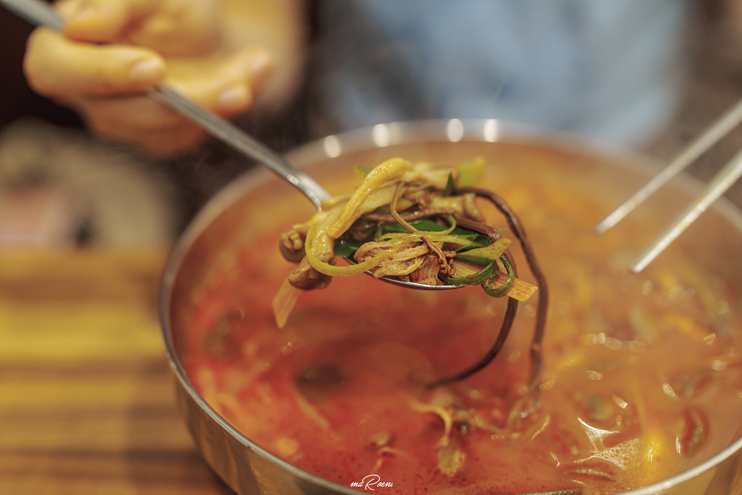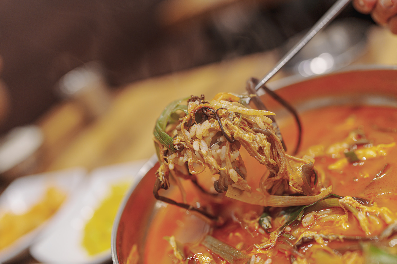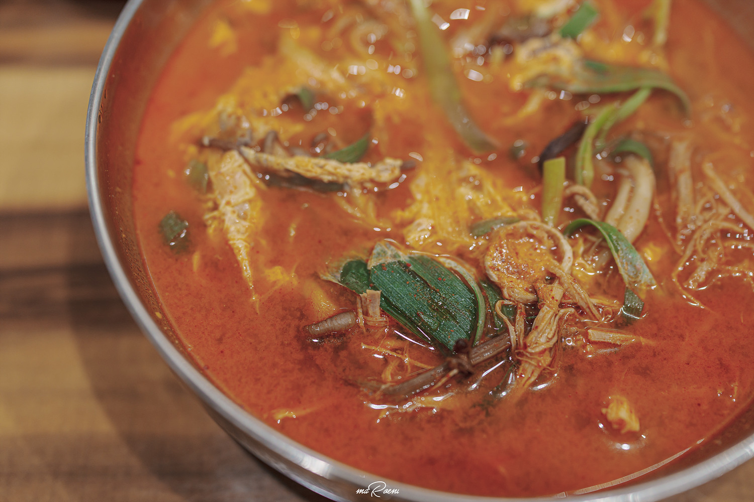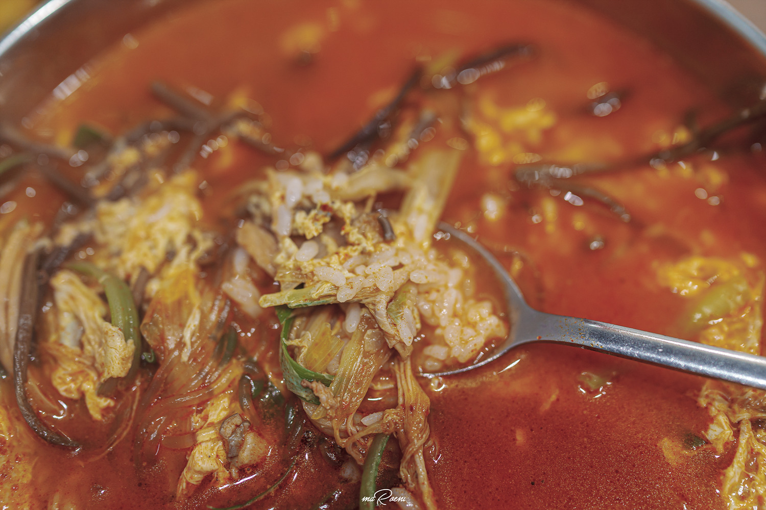 이곳 육개장을 좋아하는 두 번째 이유! 싱싱한 고사리와 버섯, 잘게 찢어진 소고가 셀 수도 없이 많이 들어있다. 고추기름으로 우려낸 얼큰하고 뜨끈한 국물을 한 모금 마시면 전날 먹었던 술이 기억나지 않을 정도로 속이 시원하게 풀려서 해장용으로 애용하고 있다.
