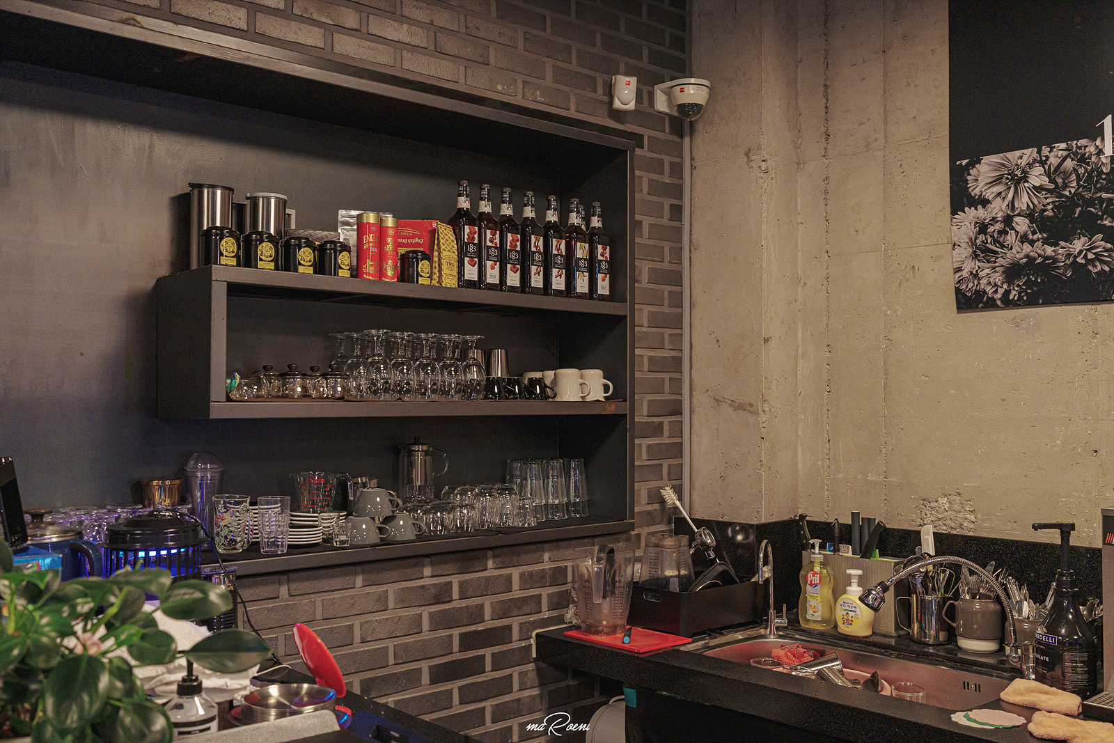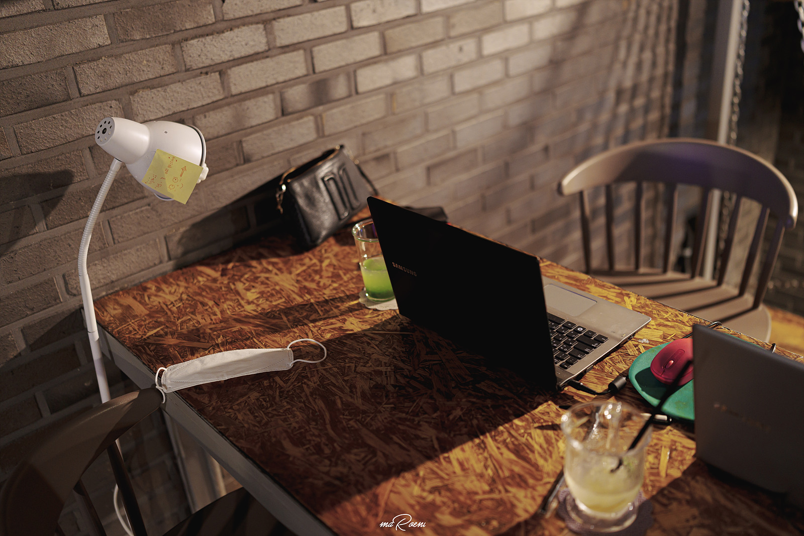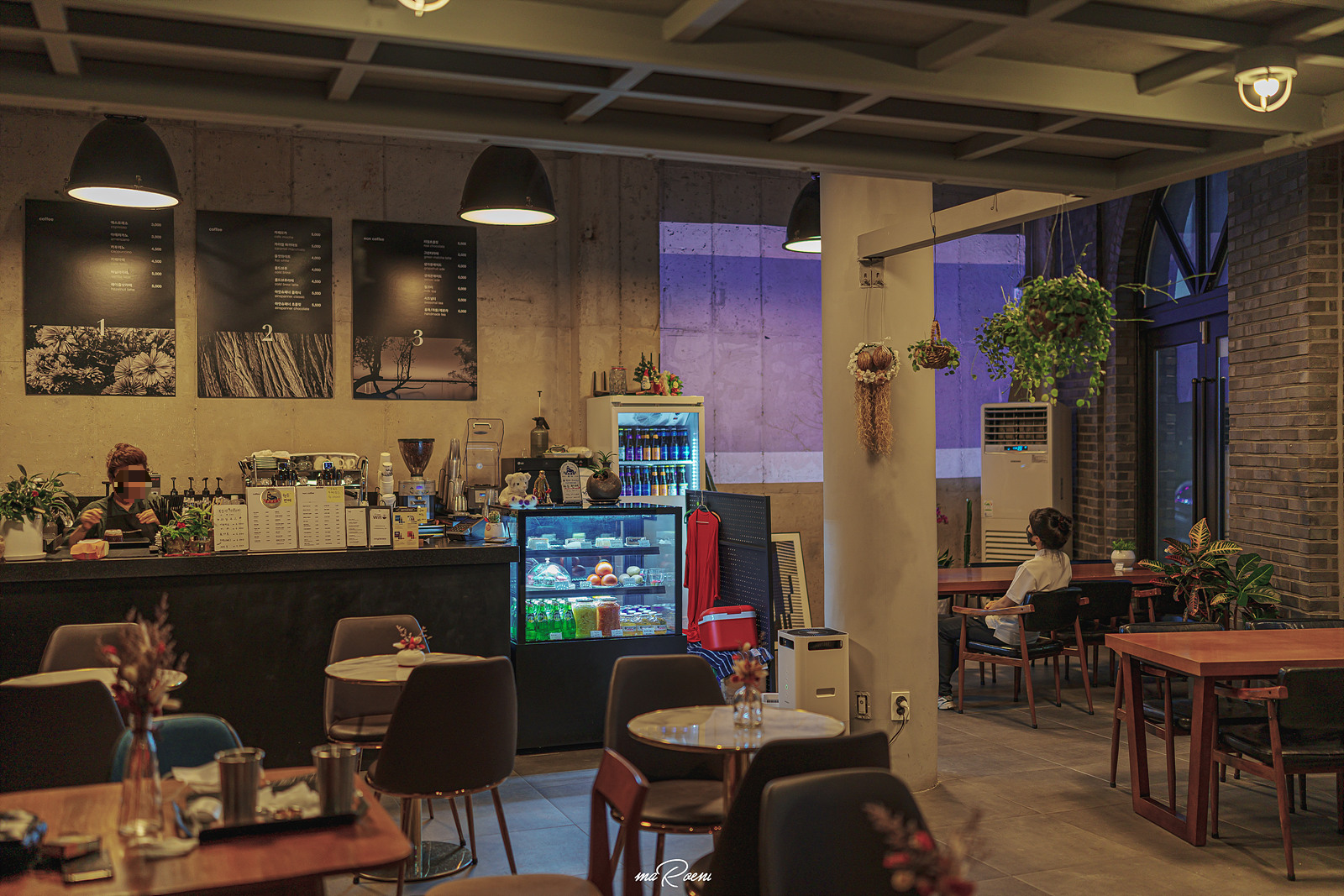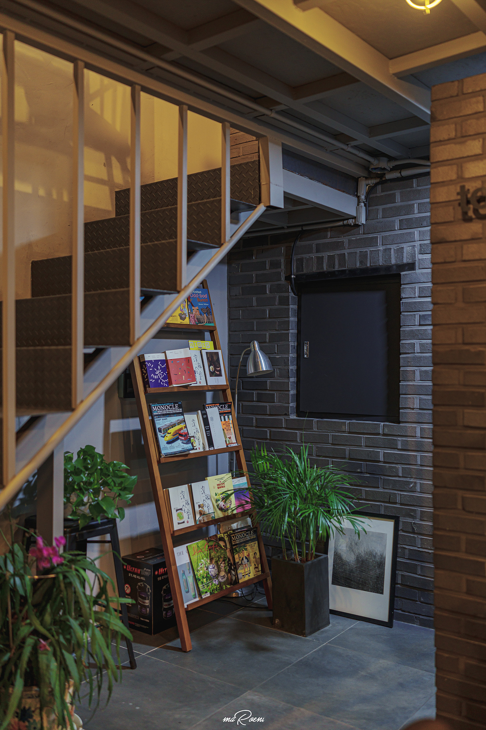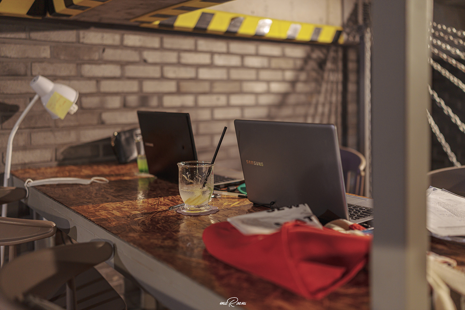 계단을 따라 올라가면 노트북을 사용할 수 있는 2층 공간이 나온다. 2층에는 테이블이 4개가 있었는데, 공간이 그리 넓지 않아서 사람들이 가득 찰 경우에는 사적인 대화가 어려울 정도로 너무 다닥다닥 붙어있는 느낌이 강했다. 이날 챙겨간 렌즈가 35mm 였는데도 한번에 다 담아내지 못할 만큼 비좁았음. 16mm 광각이었으면 시원하게 다 담았을텐데.