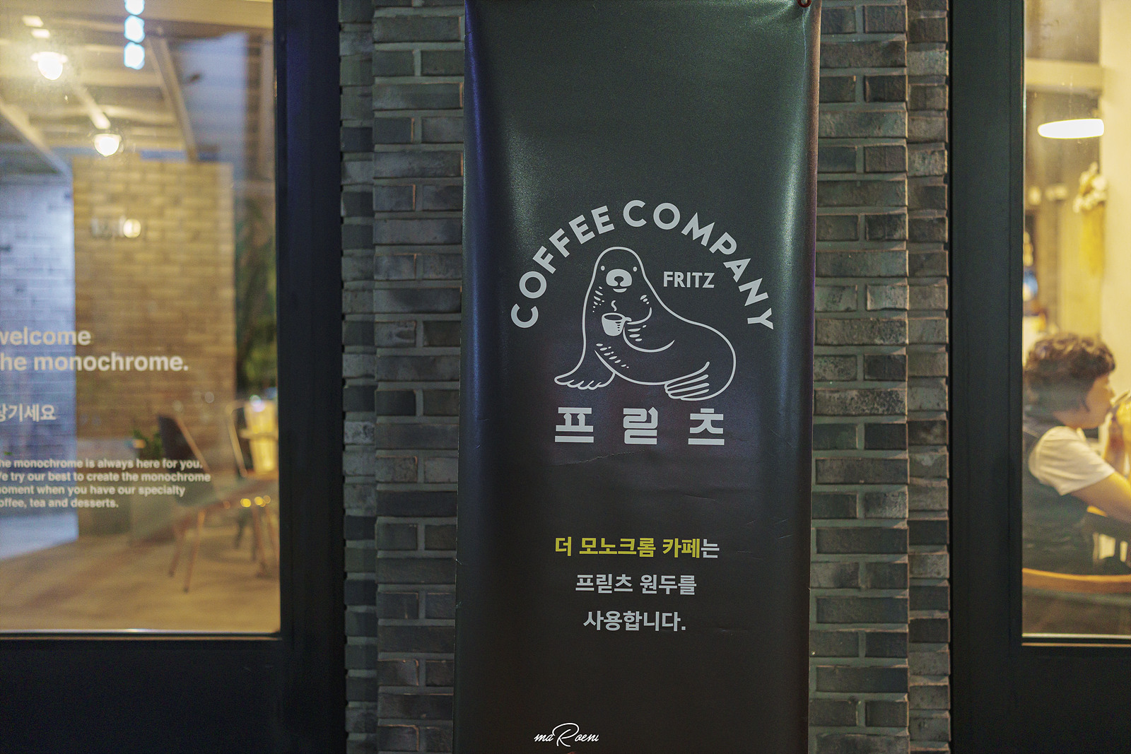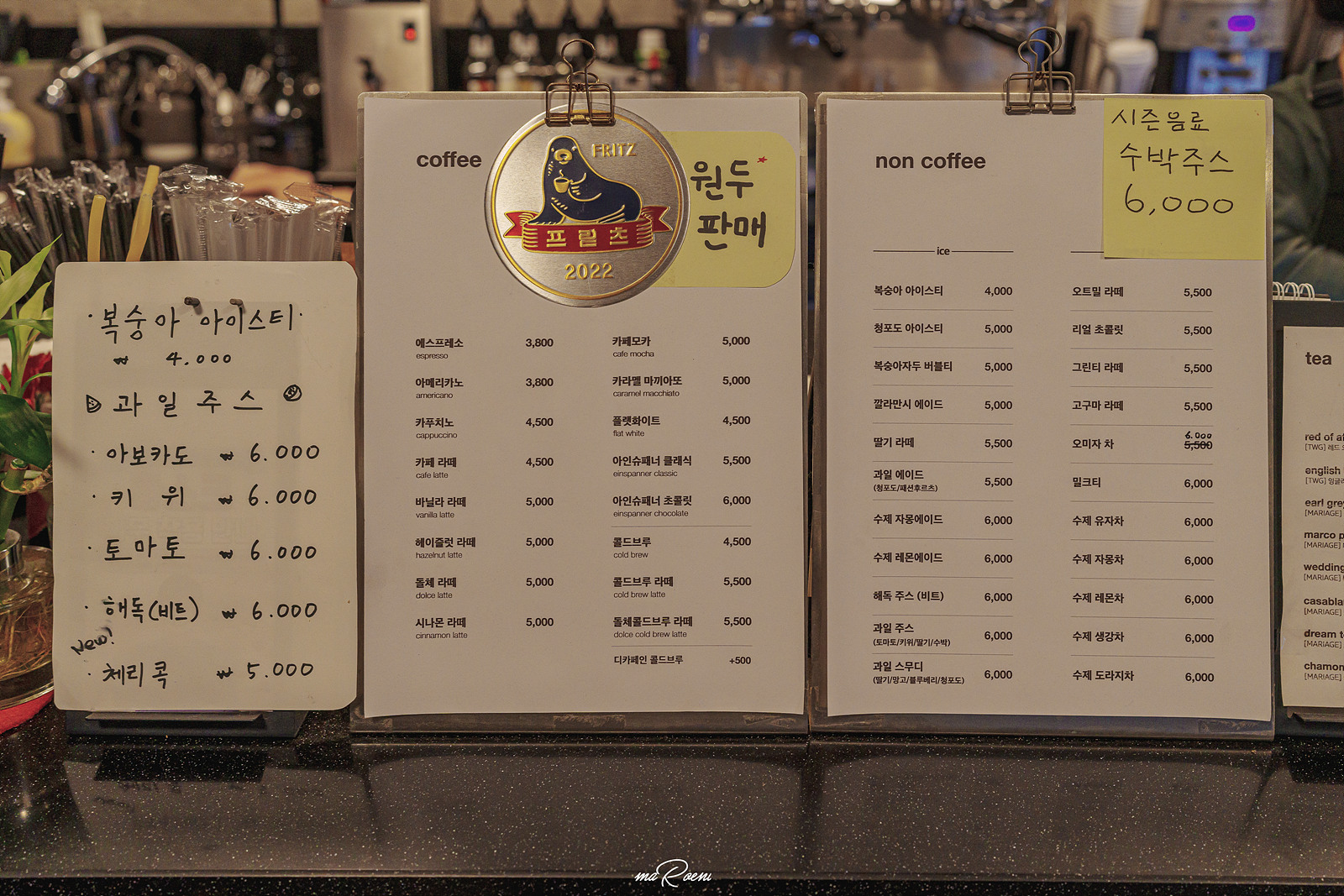 카페 더 모노크롬은 프릳츠 원두를 사용하고 있다고 한다. 물개 로고가 인상적인 프릳츠 컴퍼니는 커알못인 필자도 알고 있을 정도로 인지도가 높은 브랜드다. 근데, 알고만 있을 뿐이지.. 실제로 먹어본 적은 없어서 메뉴를 고르기 전부터 커피의 맛이 기대가 되기 시작했다.