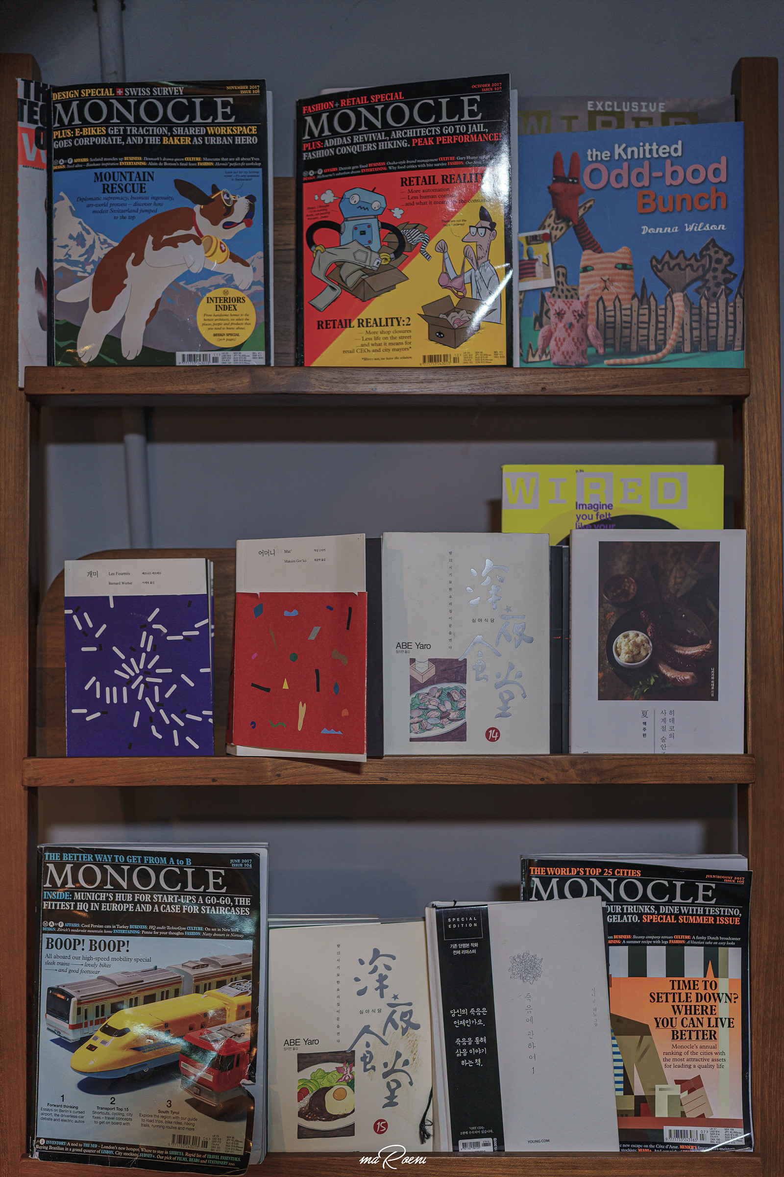 카운터 반대편에는 작은 책장이 있는데, 이곳에는 영국의 저널리즘 디자인 매거진인 MONOCLE(모노클)이라는 잡지가 진열되어 있었다. 2007년에 영국에서 런칭된 모노클 매거진에는 문화, 브랜드, 인테리어, 예술, 비즈니스 등등의 이슈를 안내해주는 매거진이라고 한다. 더 모노크롬이라는 카페 이름과 통일감을 주기 위해 이 잡지를 소품으로 사용한 것이라면 리얼 센스 만점;