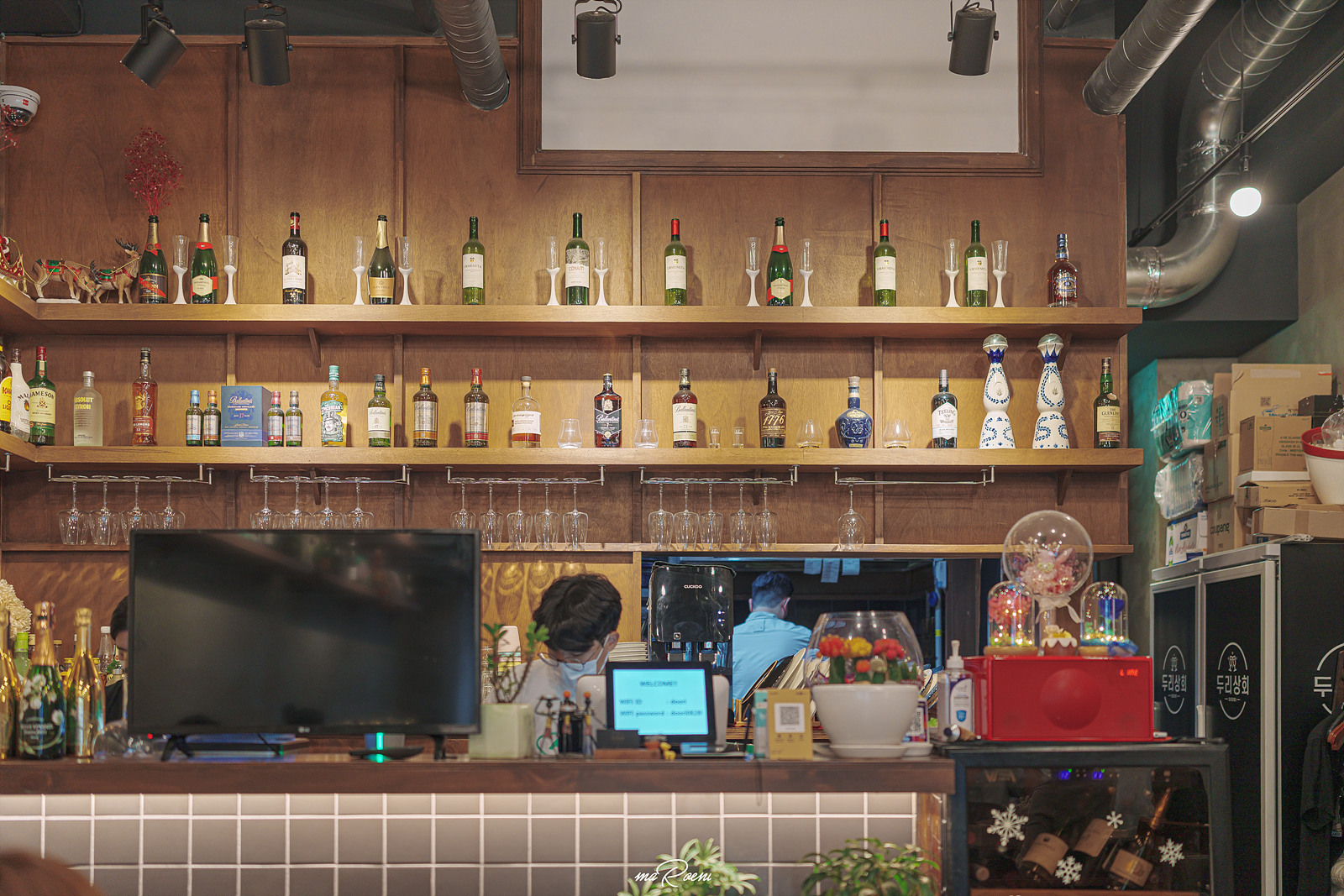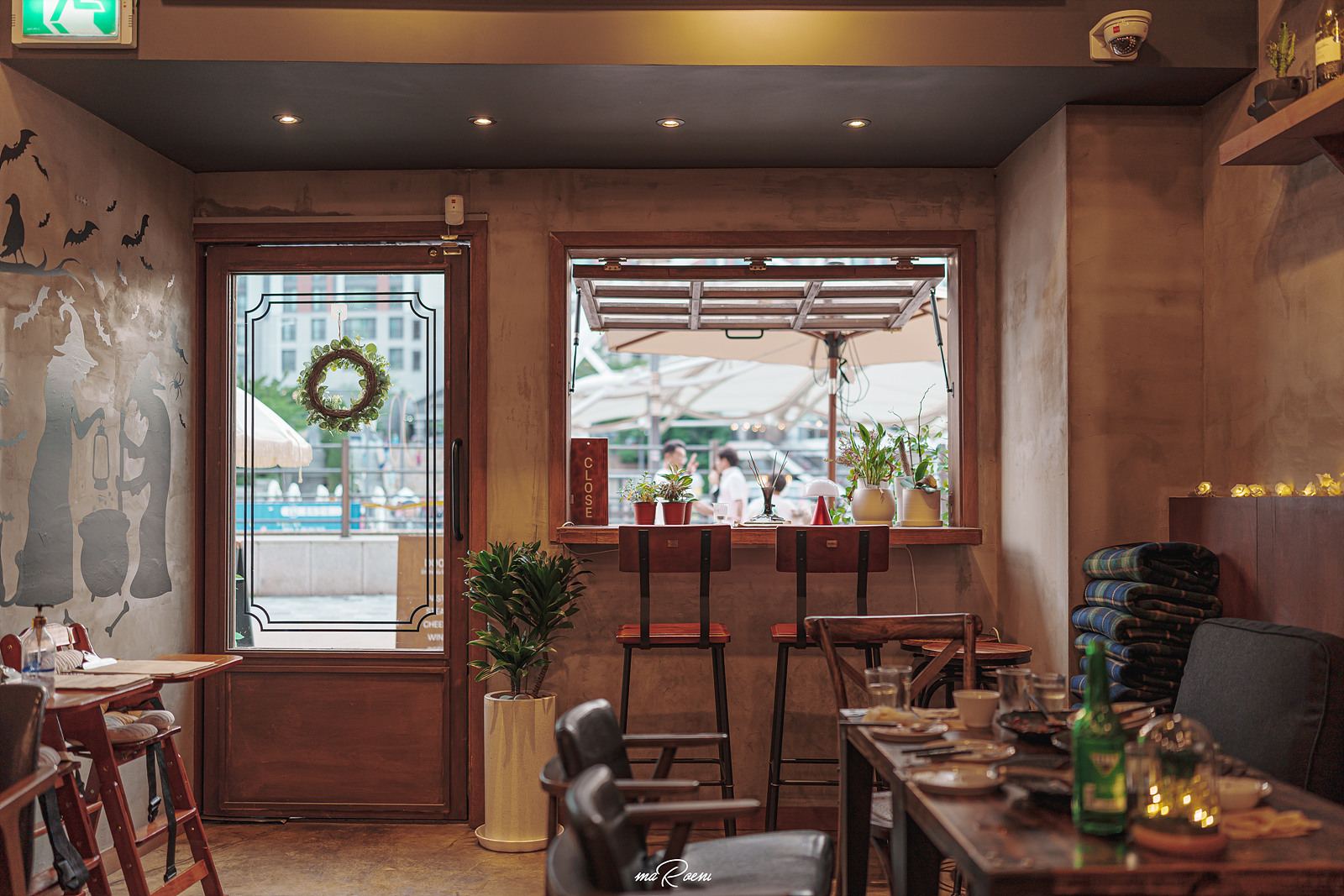 밖에서 보이는 것처럼 두리상회의 실내 역시 그리 넓지 않다. 작은 공간을 나름 효율적으로 활용하긴 했지만.. 그래도 좁다는 느낌이 계속 들었음. 테이블의 수는 창가쪽 1개, 안쪽으로 크고 작은 테이블이 6~7개 정도 있던 것 같은데, 다른 테이블에는 손님들이 계셔서 사진은 찍지 않았다. 테이블의 간격과 수를 봤을땐.. 이곳에서 분위기 잡고 와인을 마시기보다는 그냥 친구들하고 수다 떨면서 먹기 좋은 장소 같았다.