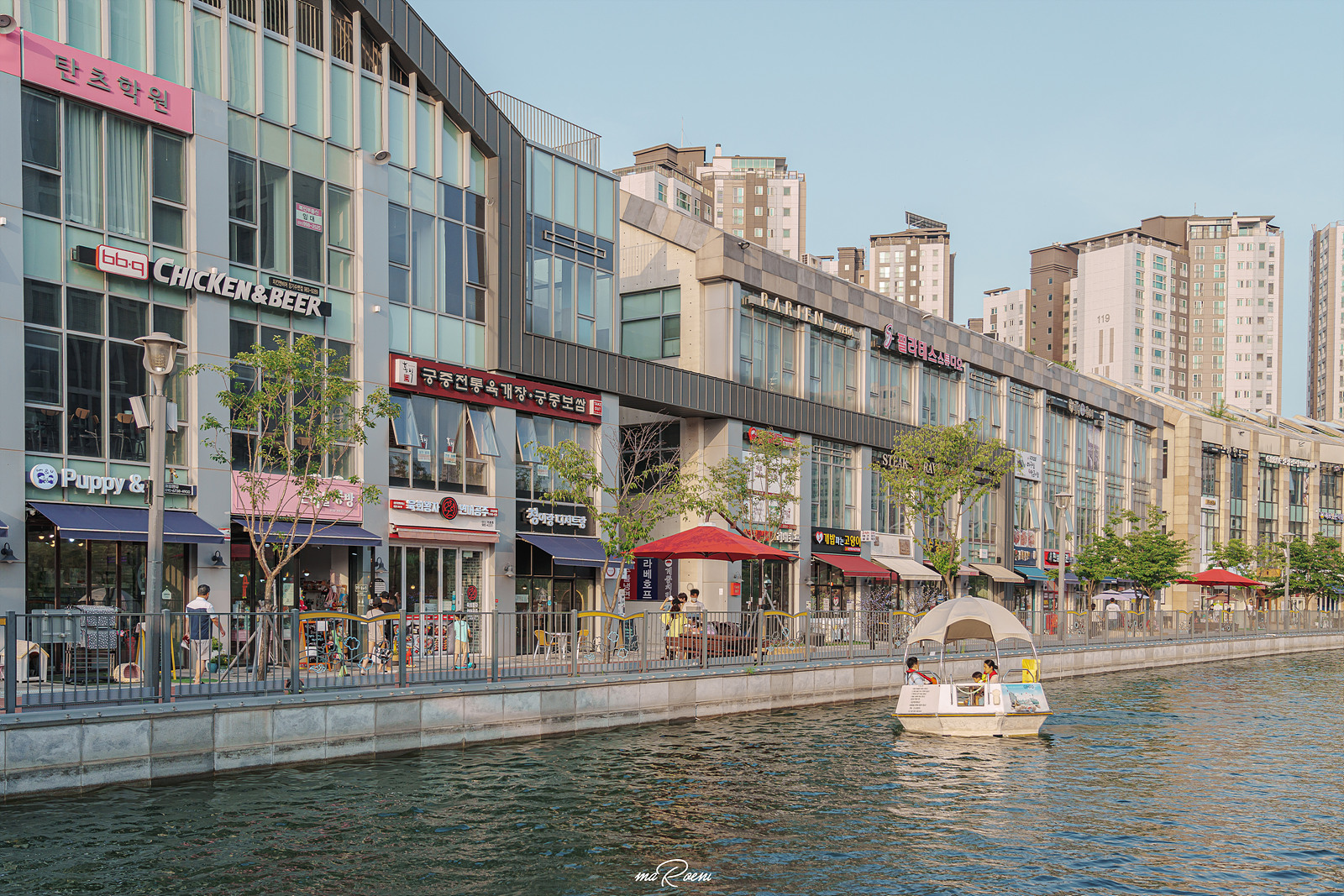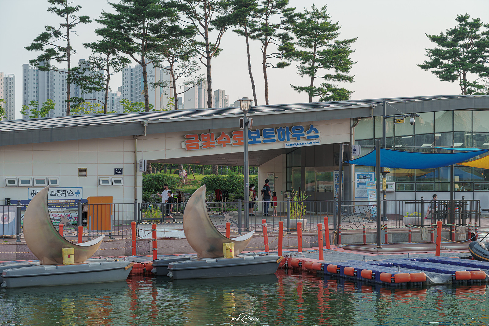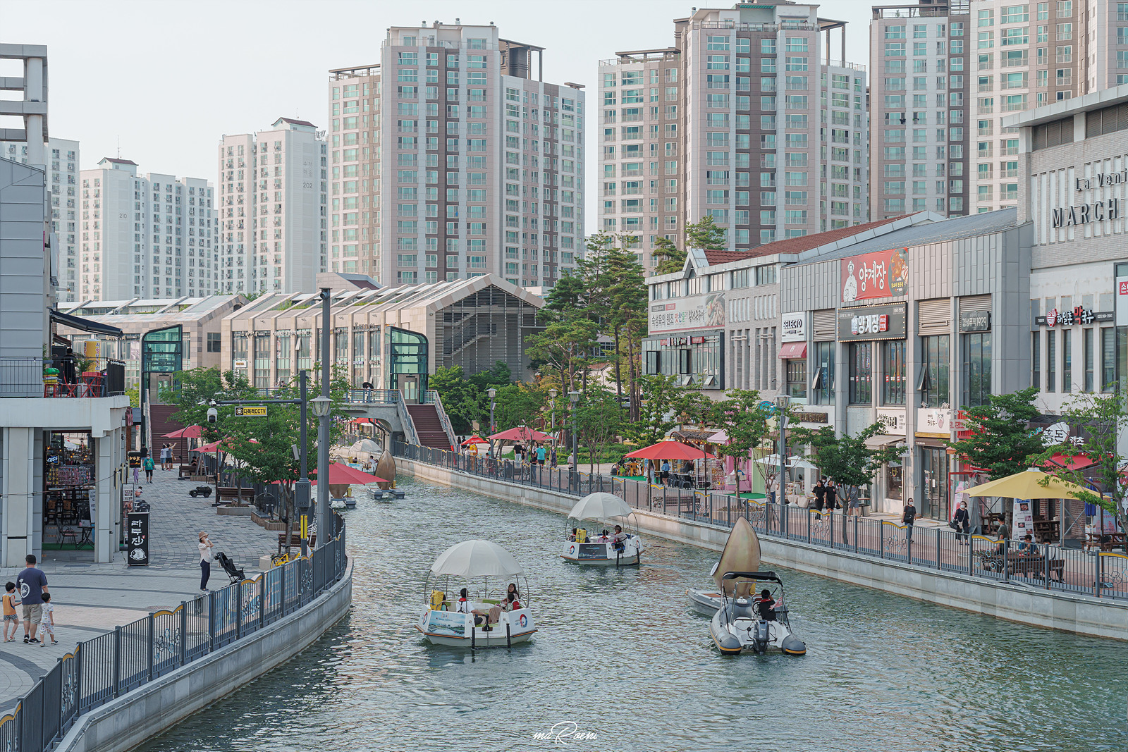 라베니체 수로를 따라 유유히 흘러가는 문보트. 이 보트는 한강중앙공원의 금빛수로 보트하우스에서 대여할 수 있는 김포 라베니체 문보트로 자세한 내용은 하단을 참고하시길.
