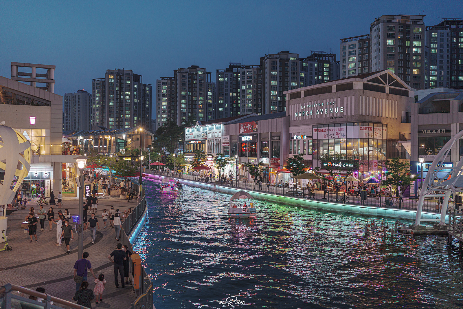해가 떨어져도 김포 라베니체 문보트는 열일중이다. 보트들이 없었다면 수로가 조금 심심해보였을 텐데 가끔 지나다니는 보트들이 그 심심한 비쥬얼을 꽉꽉 채워준다.