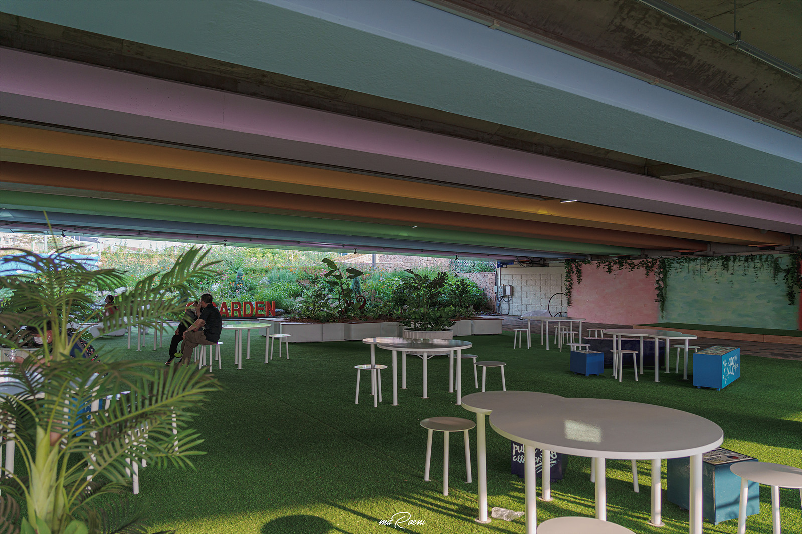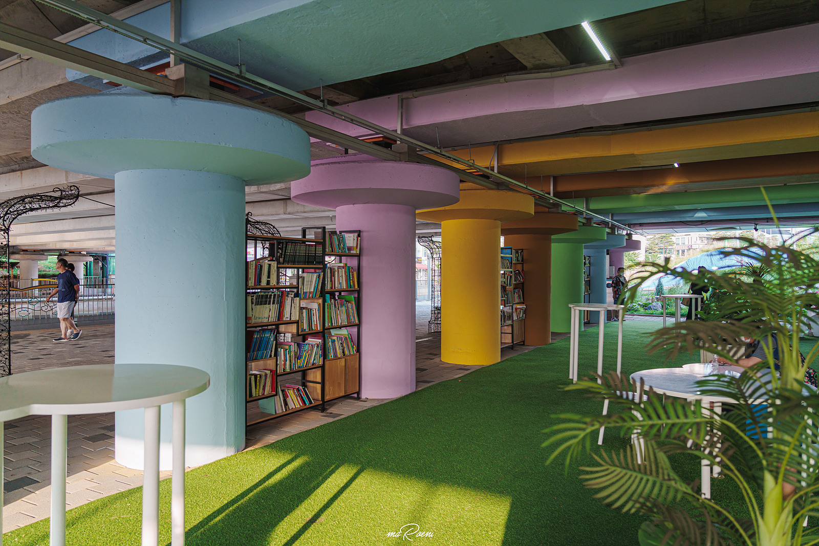 라베니체 메인홀쪽으로 돌아가던 도중 흥미로운 장소를 발견했다. 그곳의 이름은 바로 다리 아래에 위치한 금빛수로 마을정원. 이곳은 책을 읽을 수 있는 야외도서관으로 다양한 조형물들과 조명이 아름다운 곳이었다. 우리가 김포 라베니체를 찾았던 이 날은 날씨가 무척이나 더워서 숨만 쉬어도 땀이 줄줄 흘렀었는데, 이렇게 그늘진 곳에서 여유롭게 책을 읽으니 저절로 몸이 시원해지더라.