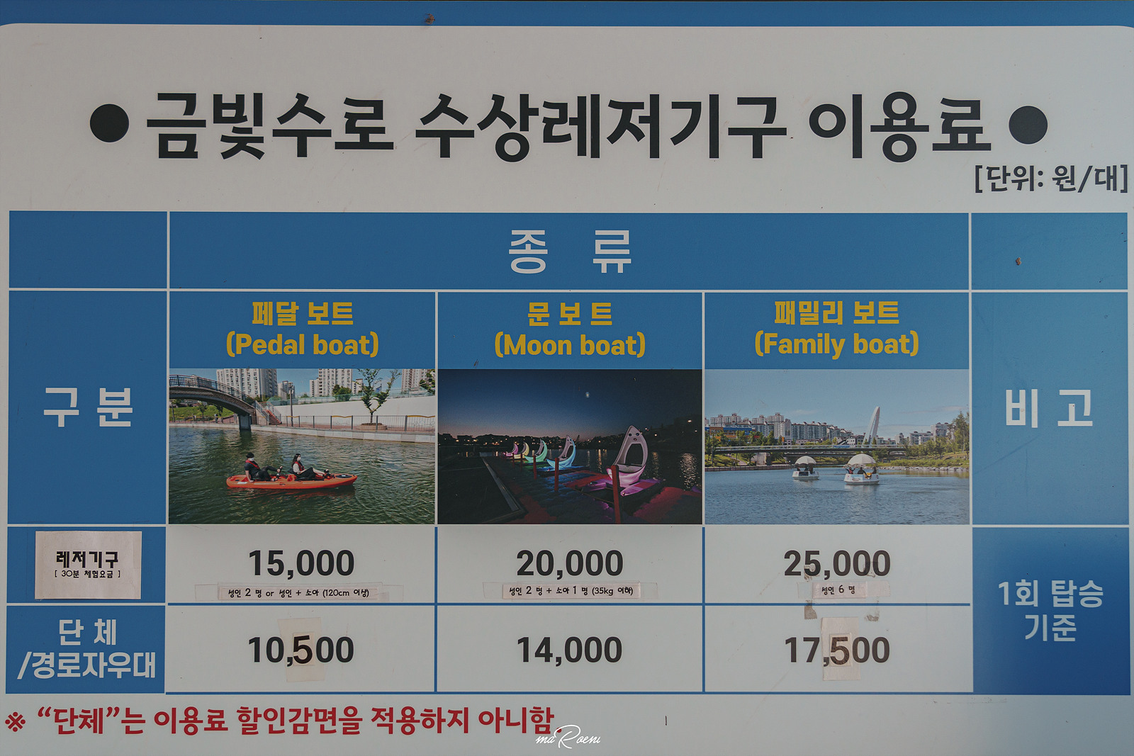 김포 라베니체 문보트 탑승 요금은 페달보트 \15,000원, 문보트 \20,000원, 패밀리보트 \25,000원으로 다소 비싸다고 느껴질 수 있다. 문보트를 비롯한 모든 보트들은 전기로 구동되기 때문에 어른아이 할 것 없이 누구나 편하게 탑승할 수 있다는 것이 가장 큰 장점이다. 보트 이용 시간은 약 30분.
