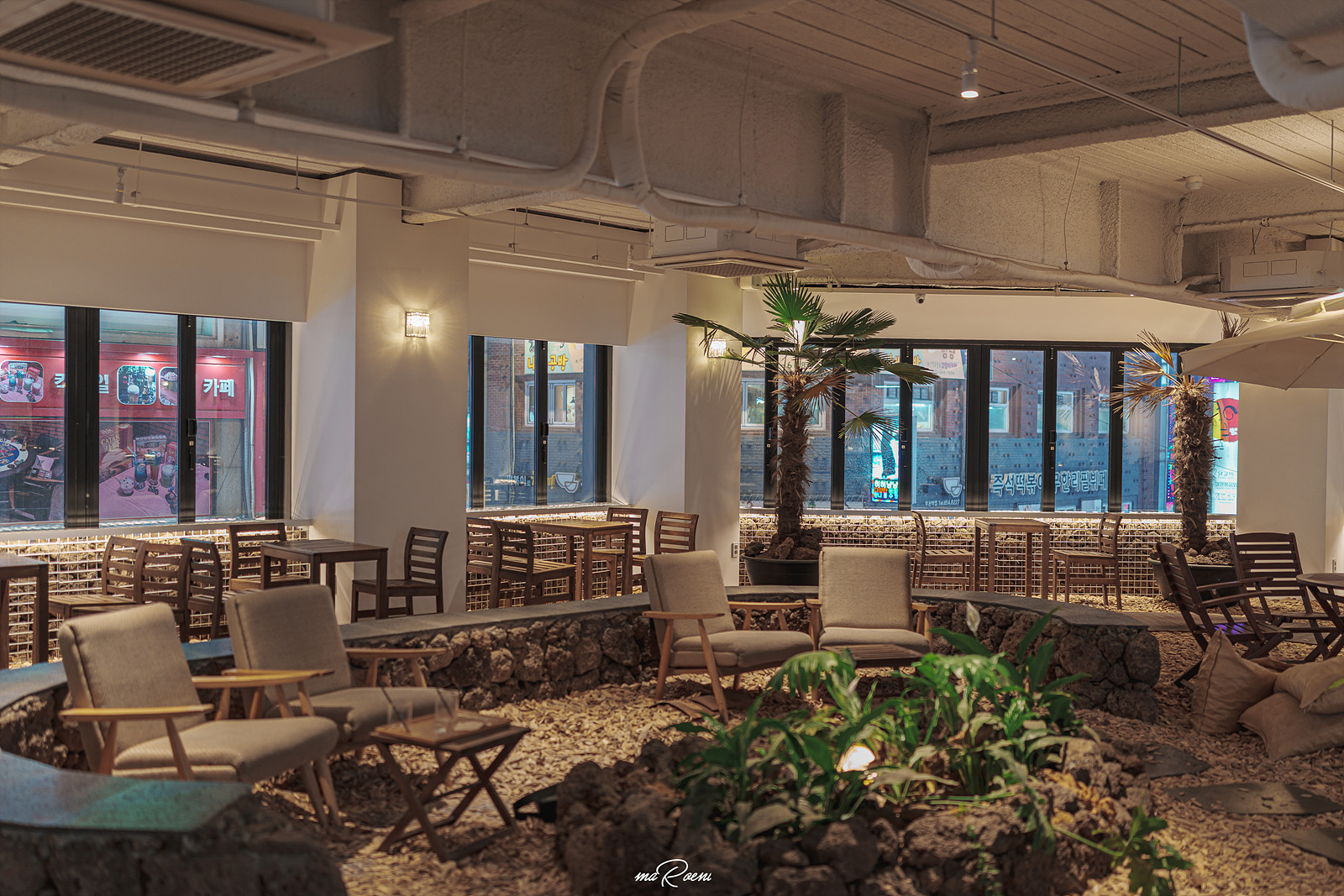 메뉴를 주문하고 나서 바로 자리를 잡고 바로 사진부터 찍으러 돌아다녔음. 보통 식당이나 카페의 공간이 협소하면 사진을 찍기가 눈치보이거나 타인에게 피해를 줄 것 같아서 조금 자제하는 편인데, 여기는 그럴 필요가 없었다. 일단 내부공간이 너무 넓어서 누가 뭘 하던 신경쓰이지도 않을뿐더러 각각의 테이블마다 제주도 감성이 물씬 느껴지는 소품들이 많아서 그자리에서 모든 사진을 커버할 수 있기 때문.