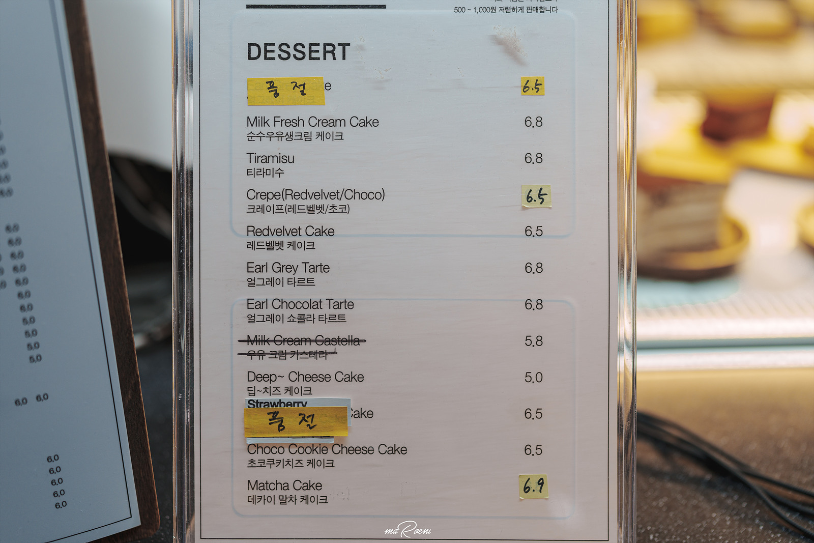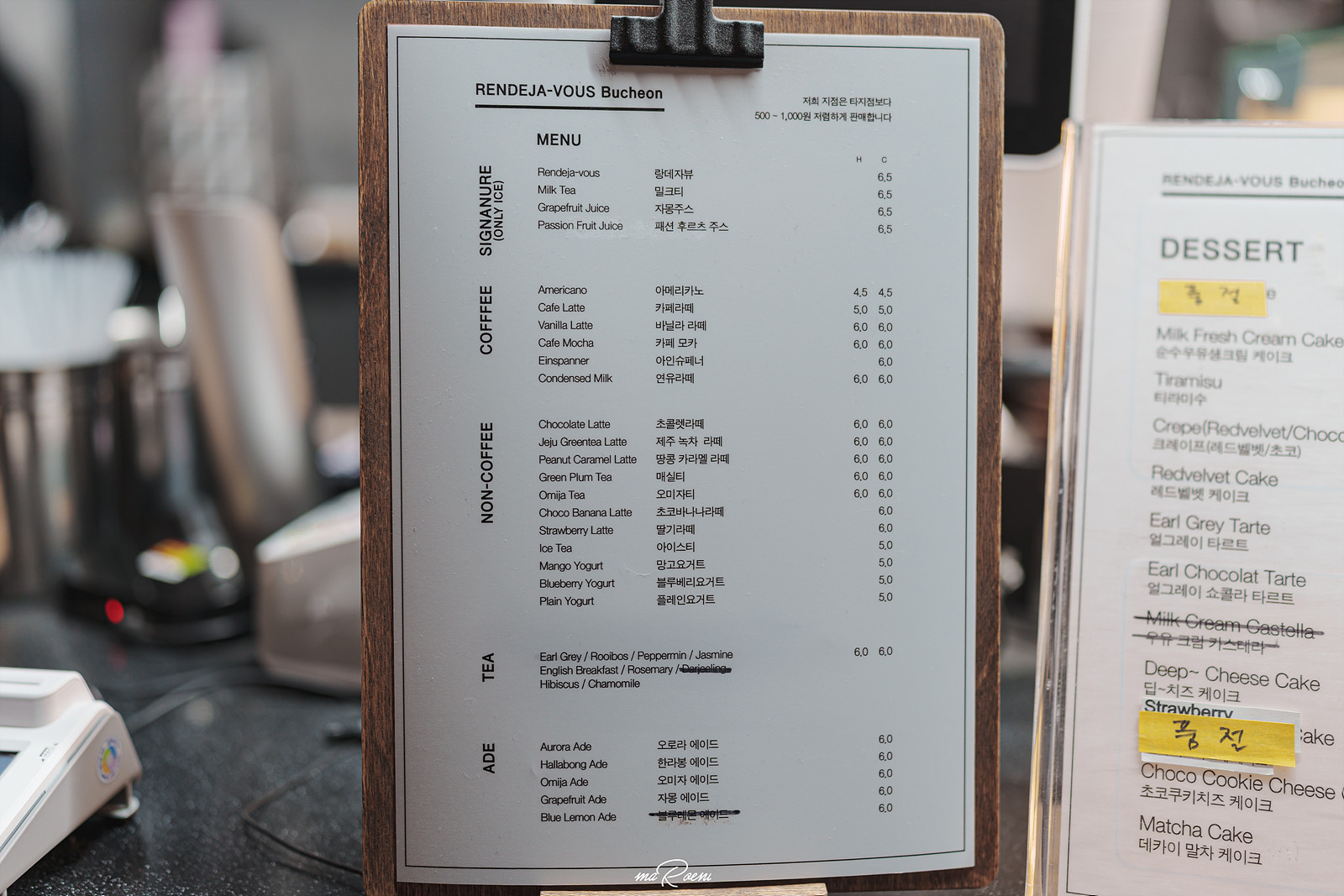 랑데자뷰 메뉴판. 전반적으로 가격은 저렴하다고 볼 수 없는 편이겠지만 요즘 컨셉을 가지고 운영하는 카페치고는 그럭저럭 납득할만한 가격. 메뉴판을 보면 랑데자뷰 부천역점이 타지점보다 \500~1,000원이 더 저렴한 편이라고 하는데, 그럼 타지점은 도대체 얼마나 비싼거냐..