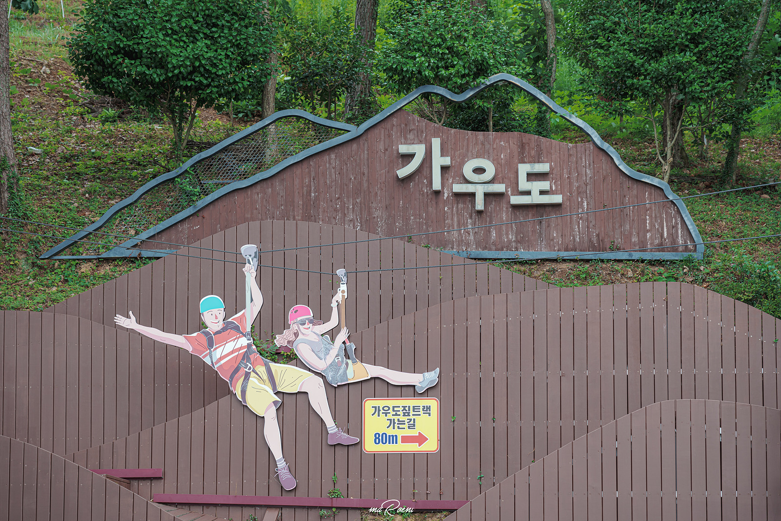 가우도 짚라인은 청자타워에서부터 시작된다. 모노레일을 이용했다면 바로 앞에 보이는 청자타워에 들어가면 되고, 모노레일을 이용하지 않았다면 산책로 표지판을 참고하여 산을 오르면 된다.