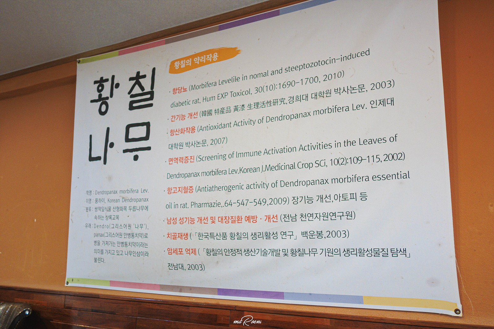 메뉴를 기다리면서 보는 황칠나무의 효능. 항당뇨, 간기능 개선, 항산화작용, 면역력증진, 항고지혈증, 성기능강화, 치골재생, 암세포 억제 등등 정말 우리 몸에 이로운 작용을 하는 모양이다. 황칠만 먹고사는 사람들은 백년 천년 건강하게 살 수 있겠다. 참고로 황칠코리아 목삼정은 이런 효능을 가진 황칠나무밭을 30만평을 보유하고 있다고 한다; 얼마나 황칠에 진심인걸까?