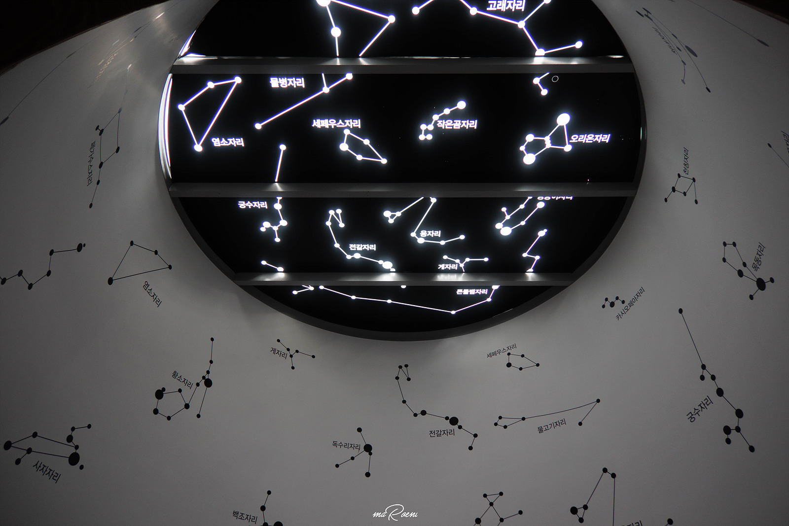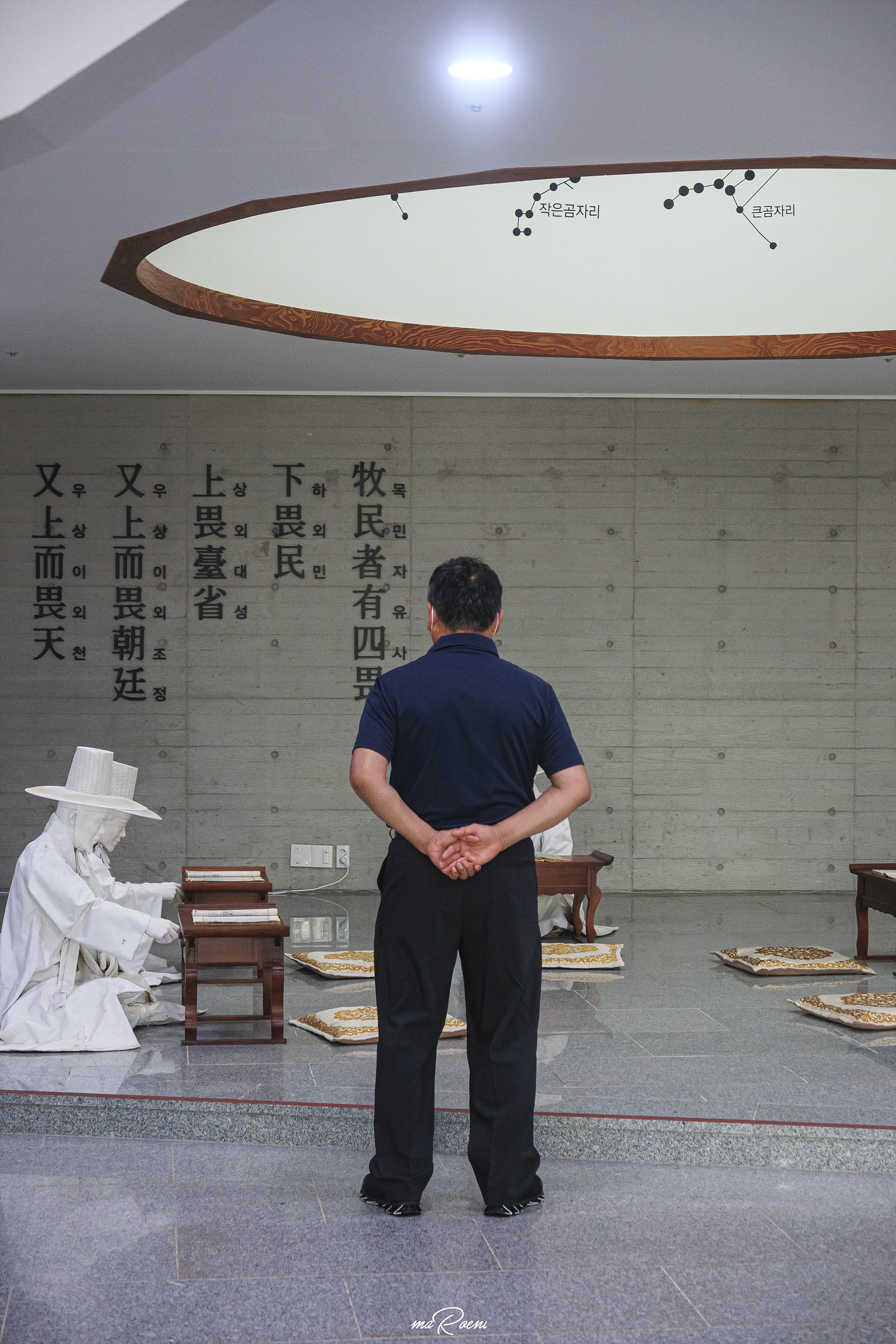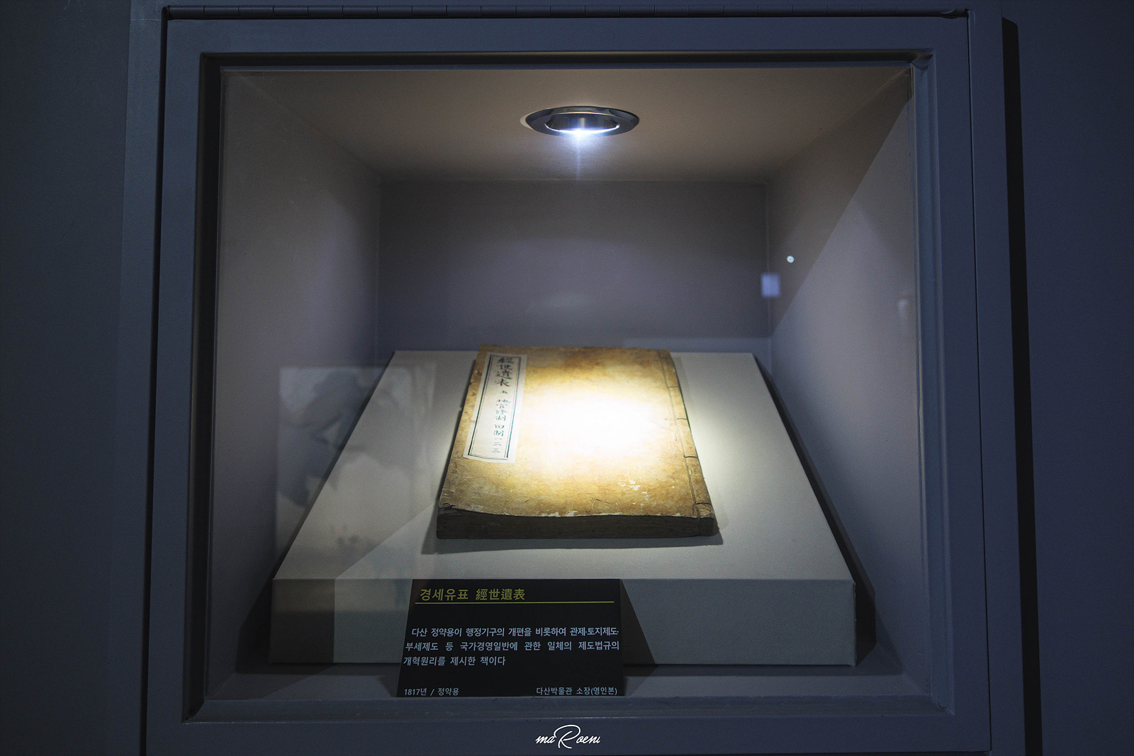 안내데스크에서 입장료를 지불하고 전시실로 들어가면 가장 먼저 실학자 정약용과 18명의 제자 상징조형물을 발견할 수 있다. 그 뒤로는 목심심서의 글귀가 적혀있으며 해당 조형물 바로 위 천장에는 여러 별자리들이 기록되어 있다. 조선 최고의 실학자 정약용은 별자리를 볼 수 있었던 것일까?