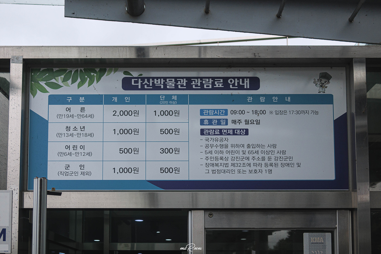 - 입장료:어른 \2,000 / 청소년&군인 \1,000 / 어린이 \500