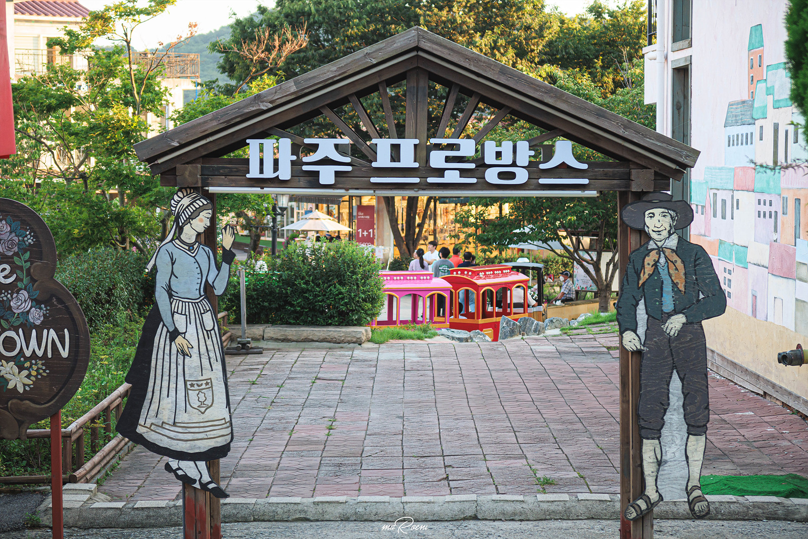 주차장에서 몸을 비틀어 골목길로 들어가면 파주 프로방스마을 입구를 만나게 된다. 주차장에는 모기만 많았는데, 마을 안쪽에는 기차도 다니고 사람들도 북적거렸다.