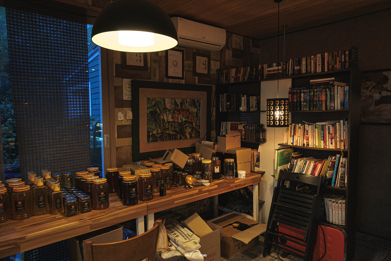 이곳은 총 3개의 공간으로 나눠지는데, 어두운 음료를 주문받는 카운터 쪽의 공간과 그 밖으로 메인홀, 그리고 야외 테라스가 있다. 카운터쪽의 공간은 사장님과 면담을 하는 분위기가 들어서 이용하기가 살짝 애매모호하고, 메인홀이나 야외 테라스를 이용하는게 좋은데, 야외 테라스는 삼디다스 모기가 너무 많아서 모기에게 잘 물리는 나에게는 지옥과도 같았다. 그래서 우리는 메인홀을 이용했다.