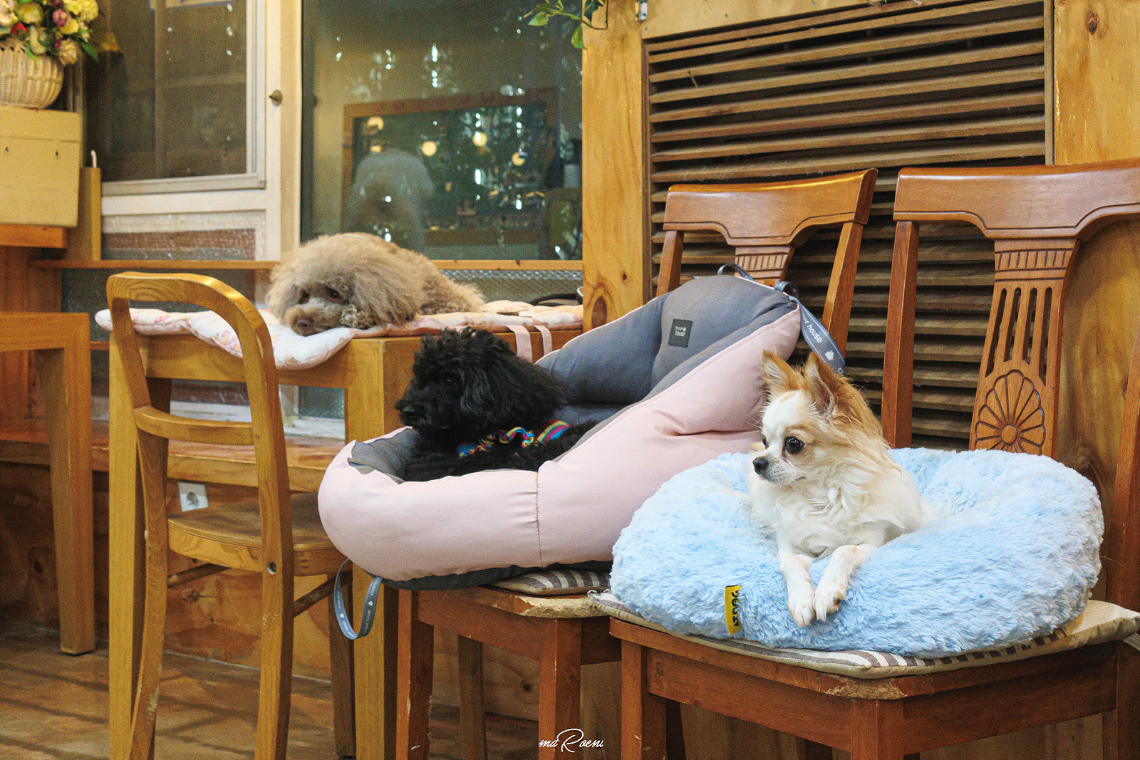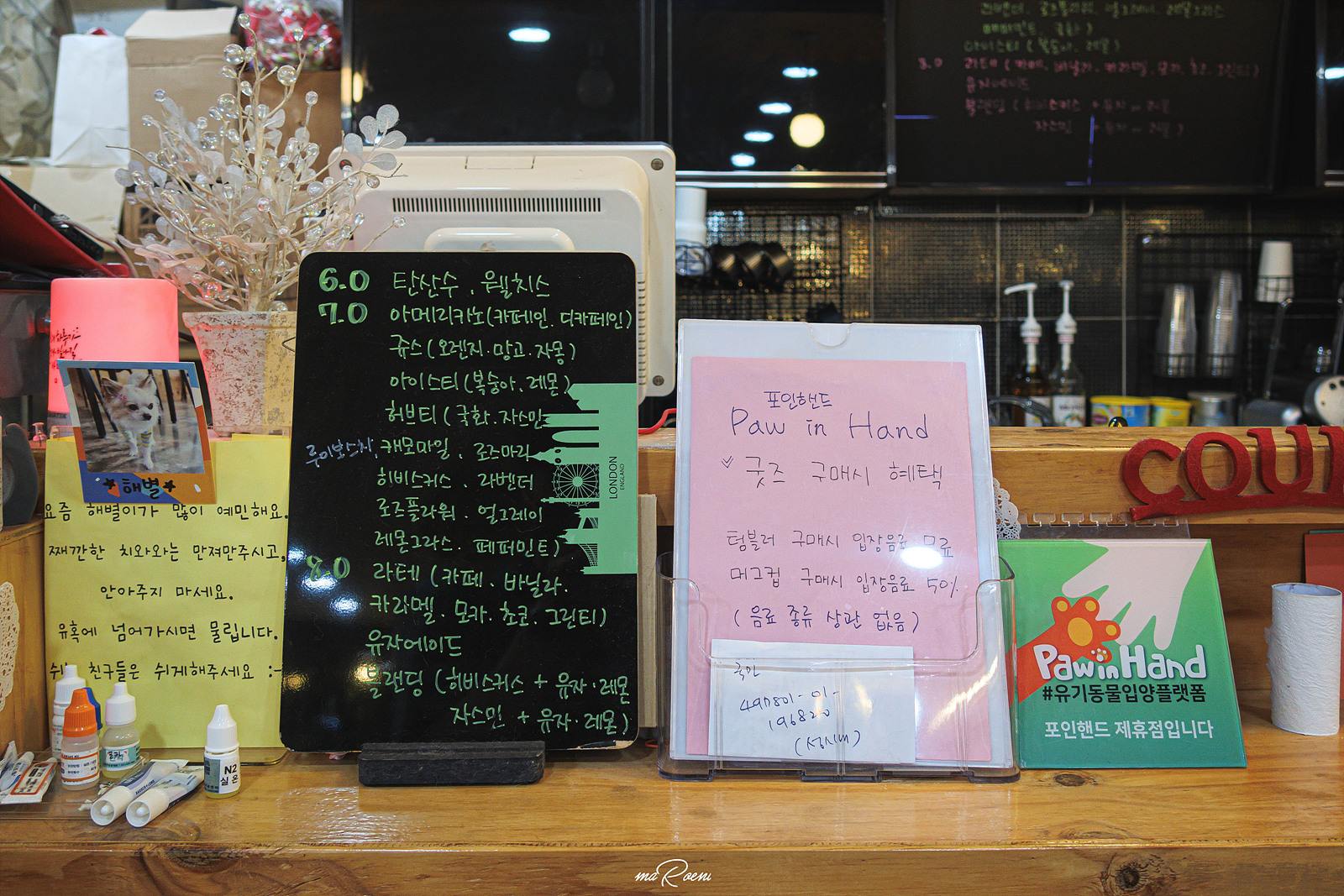 얘는 우리가 음료를 홀짝거리고 있을 때 주인이 맡기고 간 치와와인데 사장님이 놀아주려고 해도, 간식을 줘도 반응 없이 계속 주인을 찾기만 하더라.. 한때 우리도 강아지를 애견호텔에 맡겨둔 적이 있었는데, 이 강아지와 똑같았을 것을 생각하면 괜히 마음이 찡해진다는..