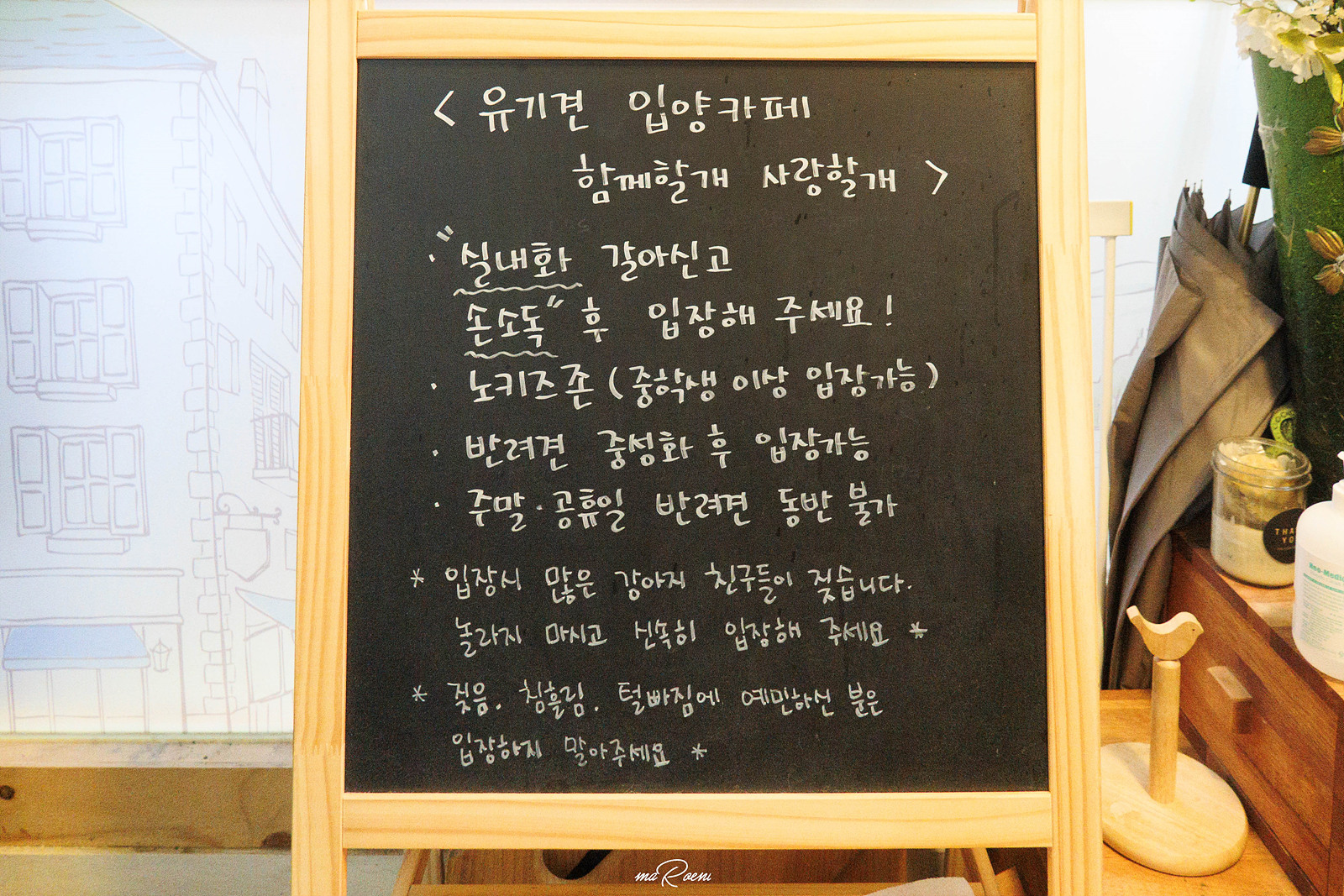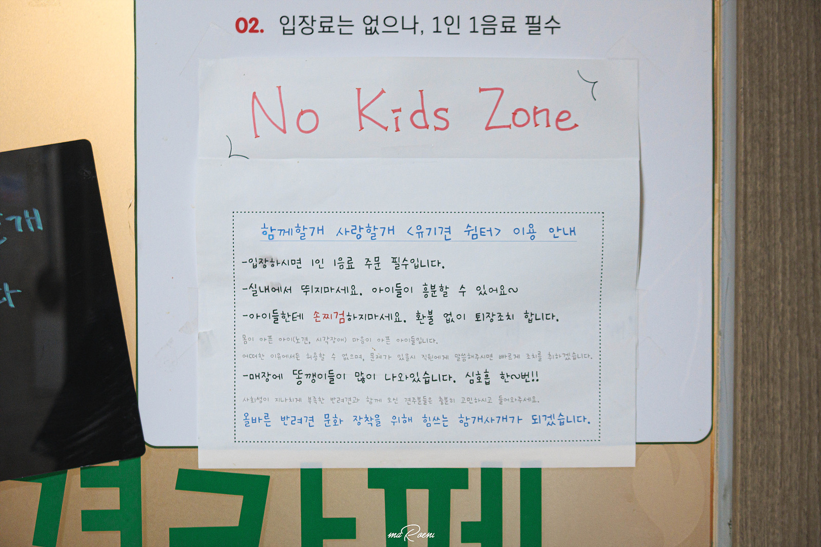 무튼, 입양할 목적으로 방문하는 것도 아니고.. 그렇다고 강아지를 맡기려고 가는 것도 아니기 때문에 이용수칙부터 읽어보았는데, 1인 1음료가 필수적이며 초등학생 이하는 입장할 수 없는 노키즈존이라고 한다. 그리고 개들이 많이 짖어대니 빠르게 입장하라는..!