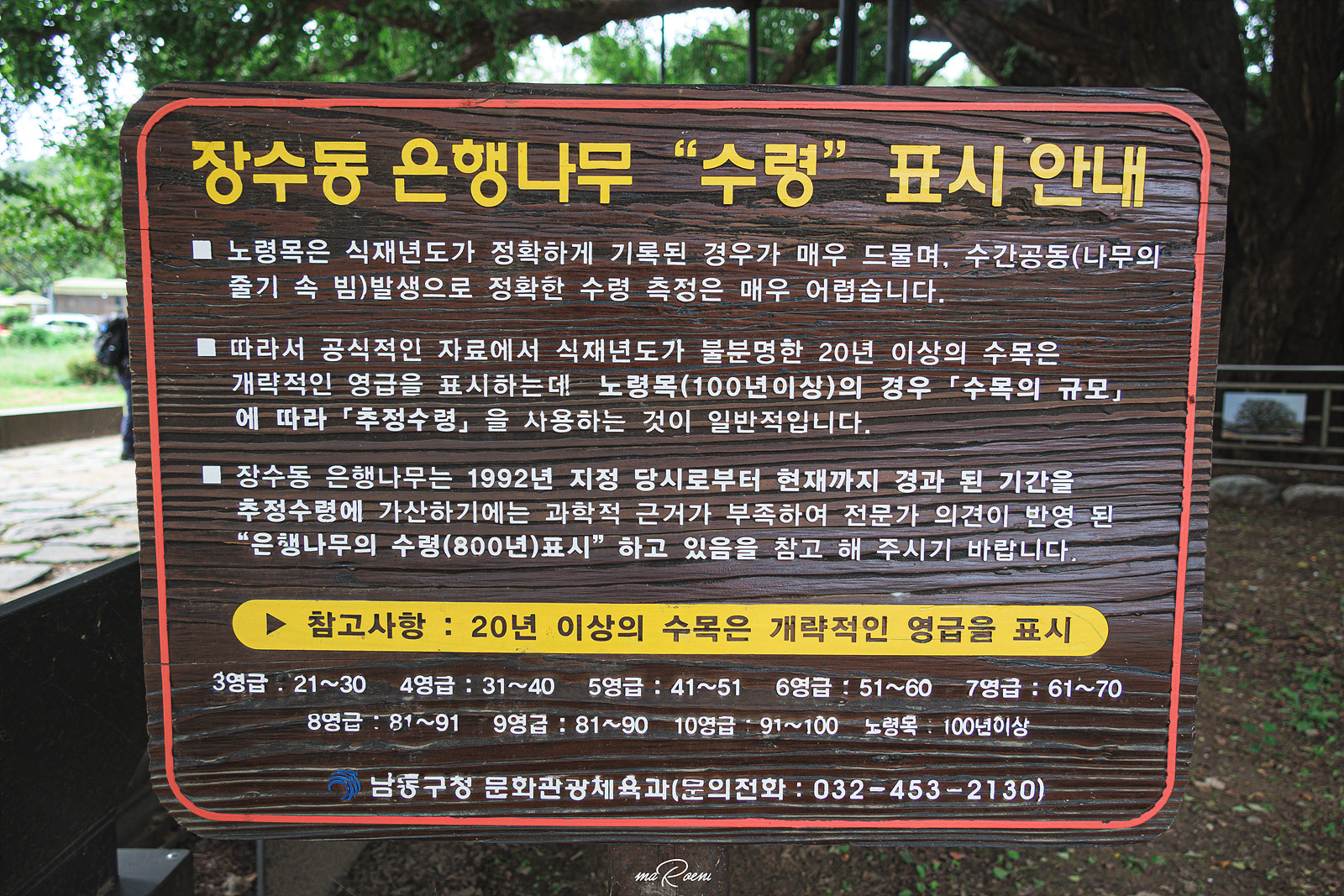 장수동 만의골 은행나무는 인천광역시 기념물 제12호로 2021년 2월 제562호 천연기념물로 지정되었다고 한다.(1992년까지는 인천광역시만의 기념물이었는데 2021년에 승격됨) 나이 약 800살, 높이 약 30m, 둘레만 무려 8.6m에 이르는 장수동 은행나무. 어렸을 때도 안내판에 800살이라 쓰여있었는데 20년이 지난 지금에도 800살이라니? 800살이라는 것은 전문가가 추정한 나이일 뿐, 실제로는 1,000살이 넘었을 수도 있다고 카더라.
